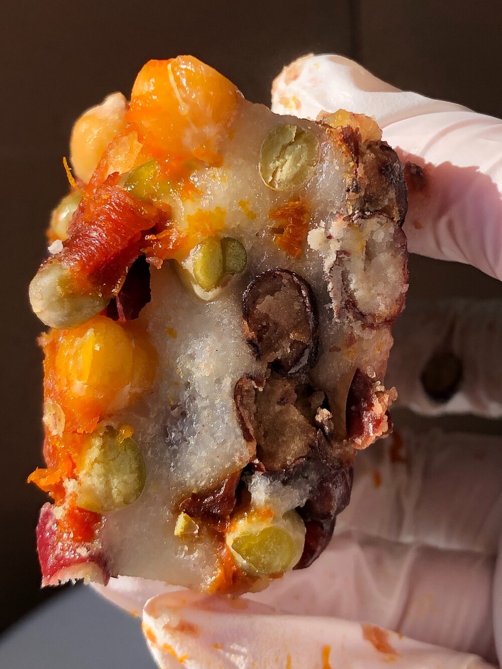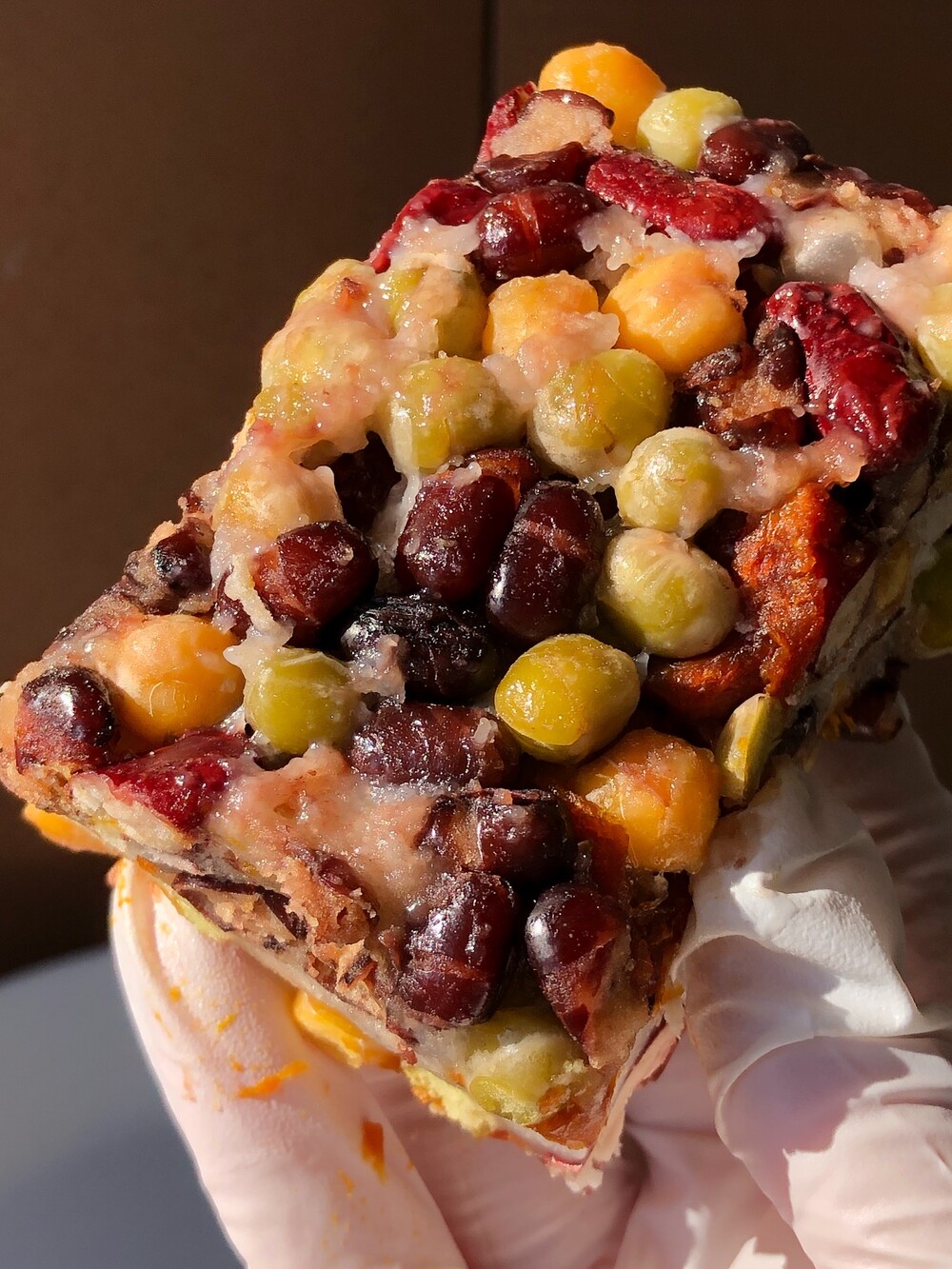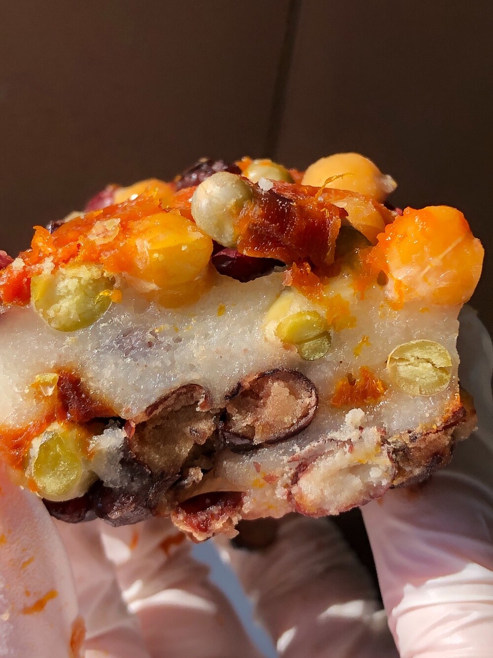 투박하고 퍽퍽한 느낌도 있고 화려하게 콩이 톡톡 살아 있고 쫀득함과 탄력이 공존하는 식감이 특징이에요. 그리고 이 다채로운 재료들을 묵직하고 탄탄한 설기가 중심에서 단단히 받쳐 줍니다. 그래서 전체적으로 아주 조화롭습니다.