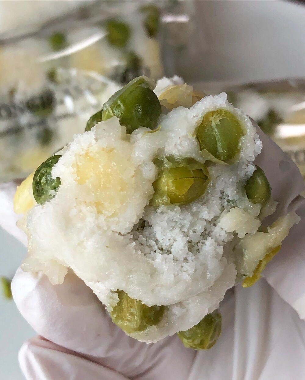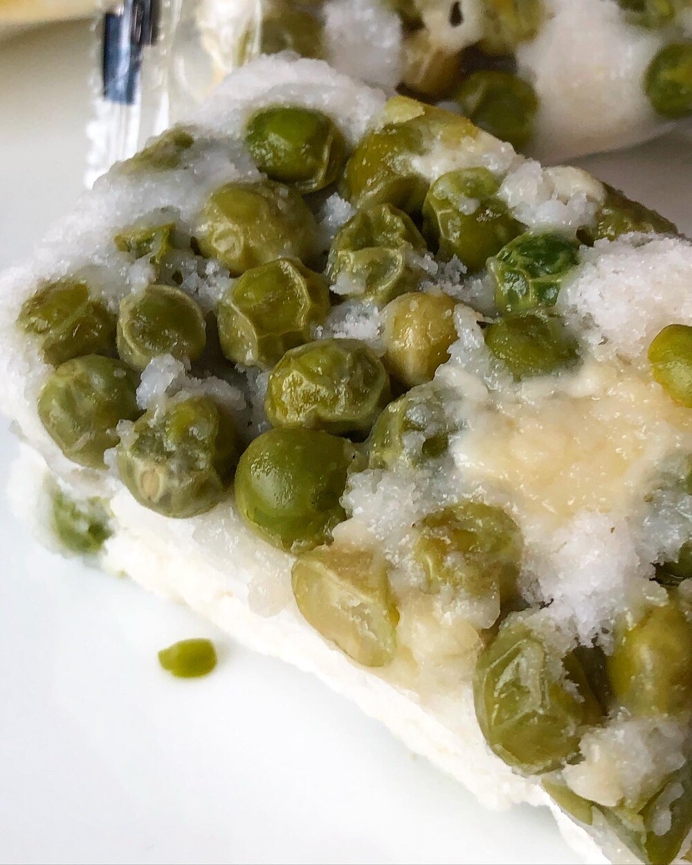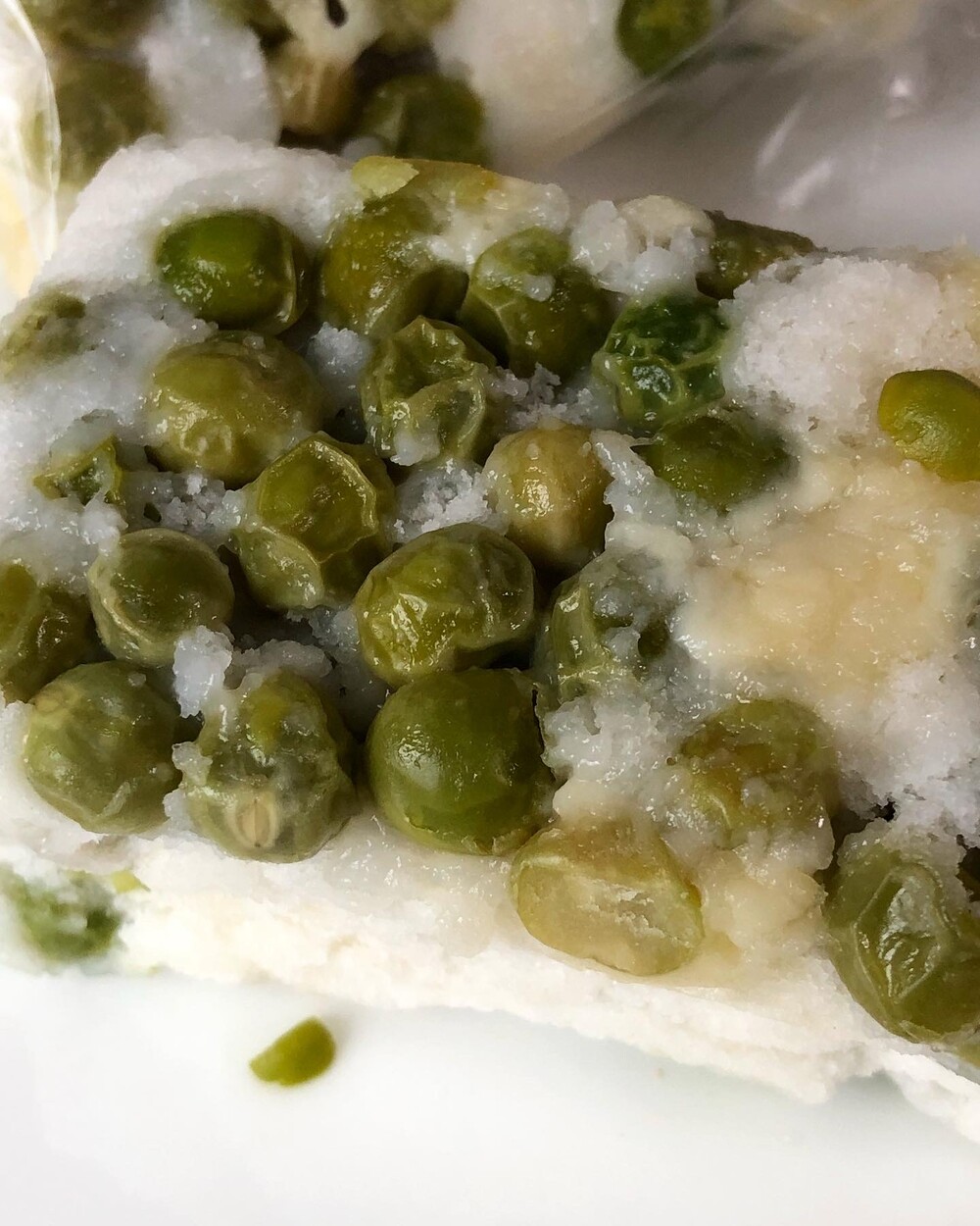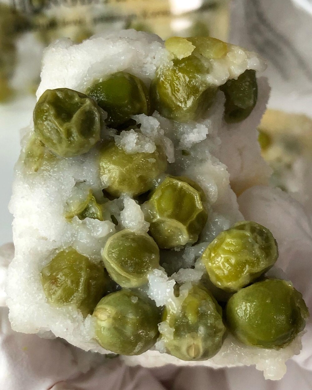 농가와 직접 계약하여 지금 가장 맛있는 완두콩을 아주 이렇게 잔뜩 넣어 봤어요. 쌀반 완두콩반 이 비율이더라구요. 완두 뭉치 설기. 참 담백해요. 완두 좋아하시면 꼭 드셔주셔야 해요.