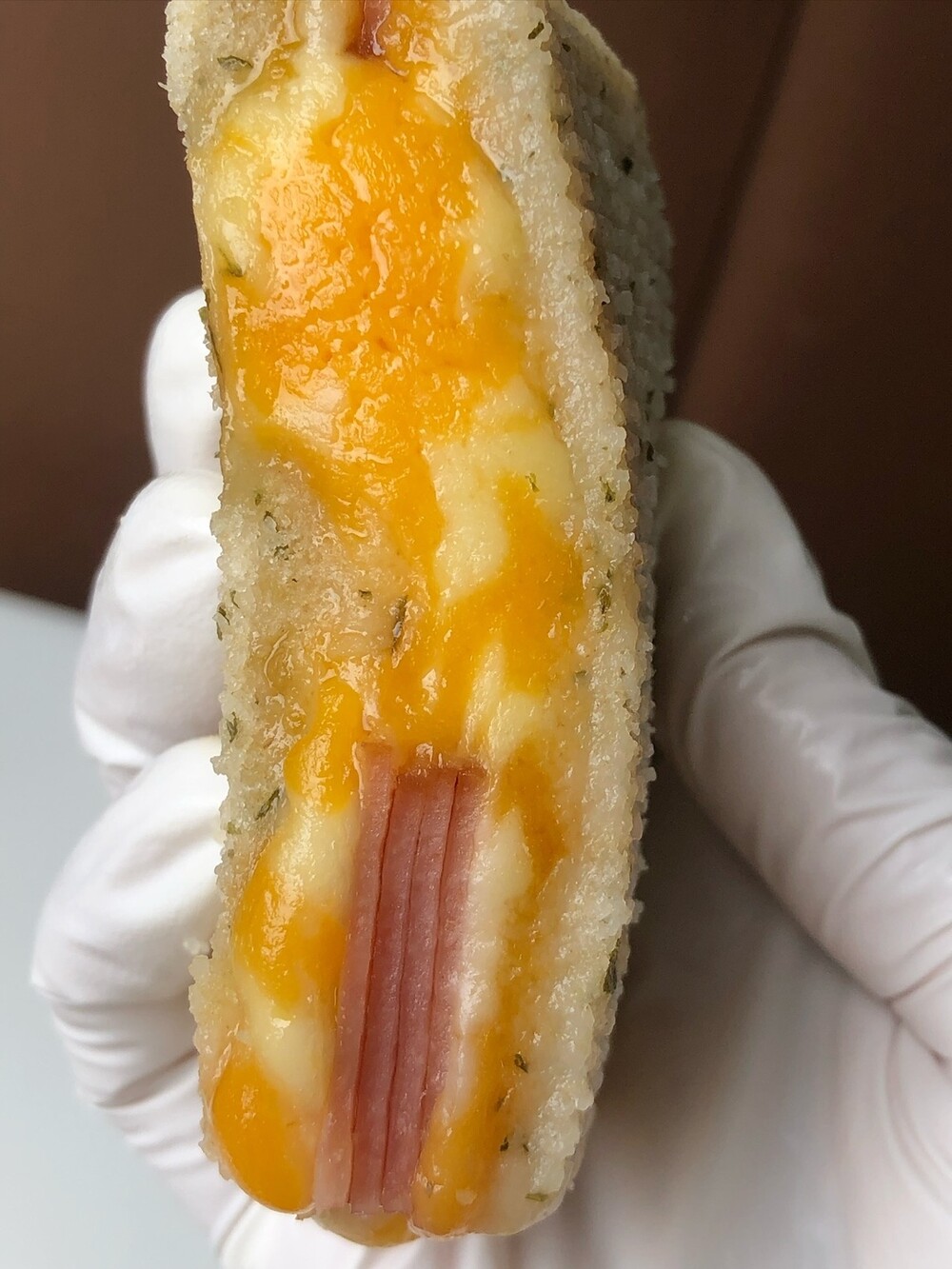 두툼한 햄을 한 번에 넣기보다는 얇은 햄을 단정하게 쌓아 여러 겹 두껍게 표현하여 식감과 풍미를 부드럽게 표현했고 체다 치즈의 녹진한 풍미와 식감이 너무 좋은 부드러운 모짜렐라 치즈를 함께 넣어 전체적으로 조합이 참 좋습니다.