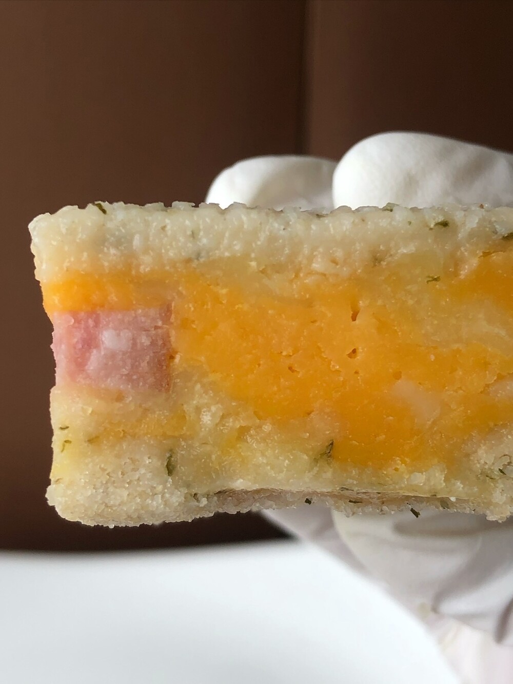 * 한 상자에 들어가는 떡을 제조하기 위해 햄과 치즈의 양이 일정합니다. 그러나 컷팅 과정 중, 한 상자에 들어가는 12조각들 중, 일부 치즈가 많은 부분 혹은 햄이 많은 부분 등 조금씩 다를 수 있습니다. 이렇게 부분적으로 햄이 없는 부분이 있을 수 있어요. 중간에 스팀이 전부 고르게 전달이 되어야 하여 띄엄띄엄 재료를 배치하여 찐답니다.