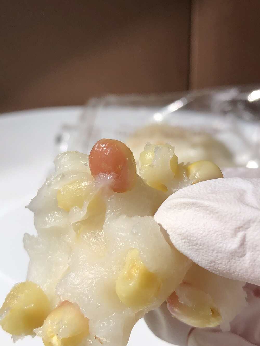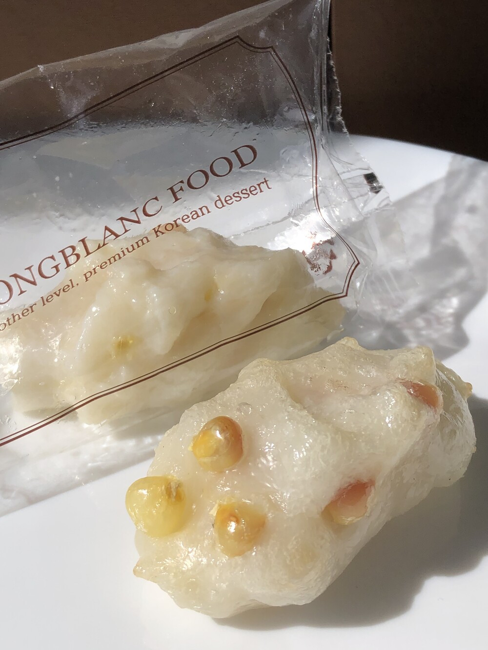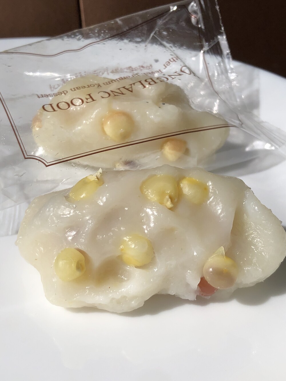 상품명: 찰옥수수 쫀득떡 식품유형:떡류 업소명:홍블랑푸드 내용량: 1box (한팩50g±10g) 20팩 원재료명 및 함량 : 멥쌀(국산)60% 찰옥수수30%(국산) 설탕3% 천일염 유통기한 : 제조일로 부터 3개월