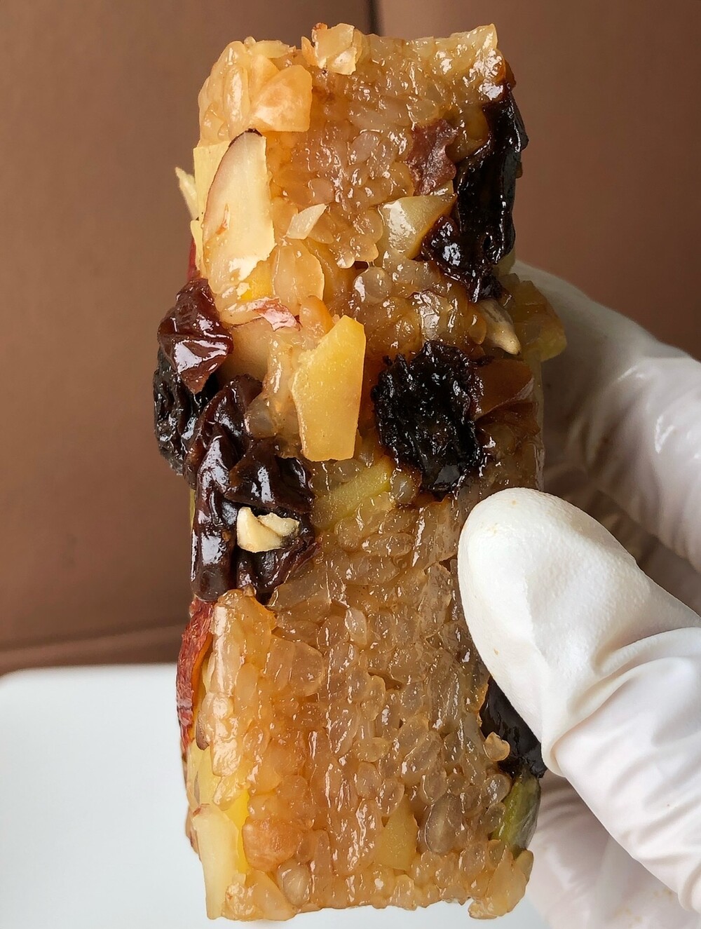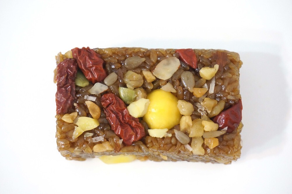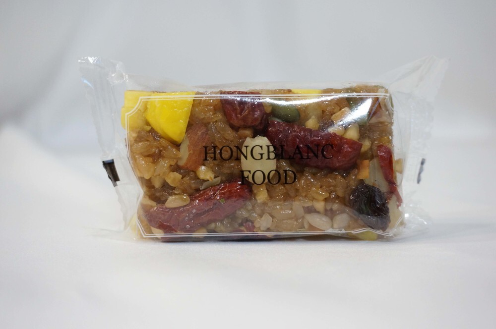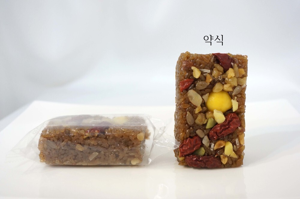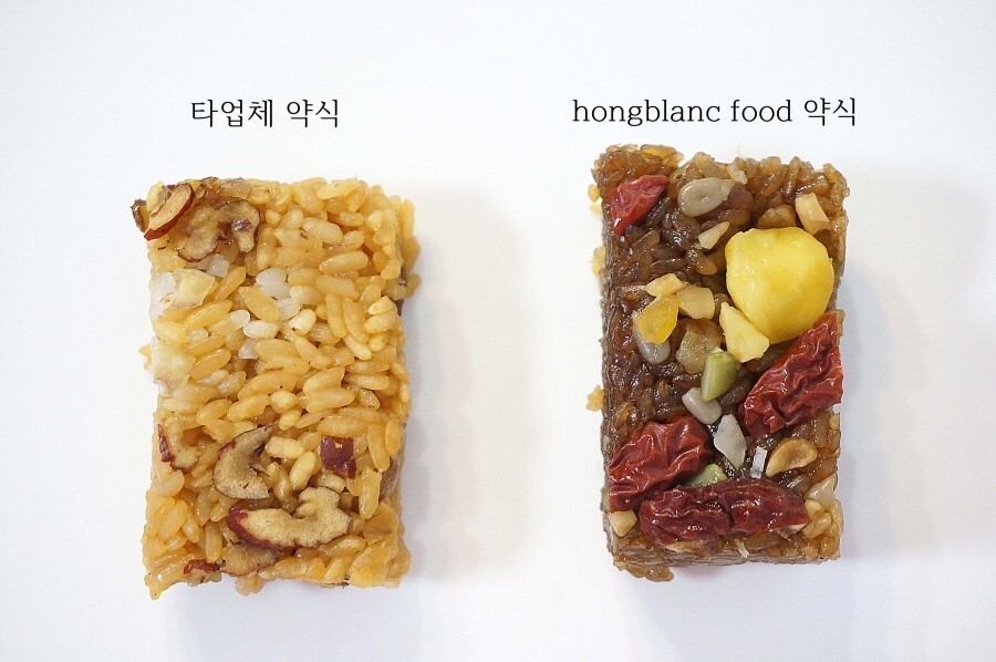 싱싱한 찹쌀을 셀렉하여 좋은 재료 가득 넣고 쫀득하게 고슬하게 찝니다. 아낌 없이 가득 넣은 재료들로 인해 참 풍성한 풍미를 자랑하지요. 한 조각만 먹어도 아주 훌륭하게 든든하게 잘 먹은 느낌이 들 거예요. 이 한 조각에 다양한 견과류들 그리고 담백한 밤과 대추가 풍성합니다. 이 재료와 잘 어우러지게 이 찰밥은 아주 고슬고슬하며 쫀득해요. 직접 짠 참기름의 풍미가 아주 녹진하고 고소함이 묵직하고요. 딱 홍블랑스레 만들어진 이 약밥, 여러 번 말씀드리지만 맛 자체가 아주 묵직하게 풍성하답니다.