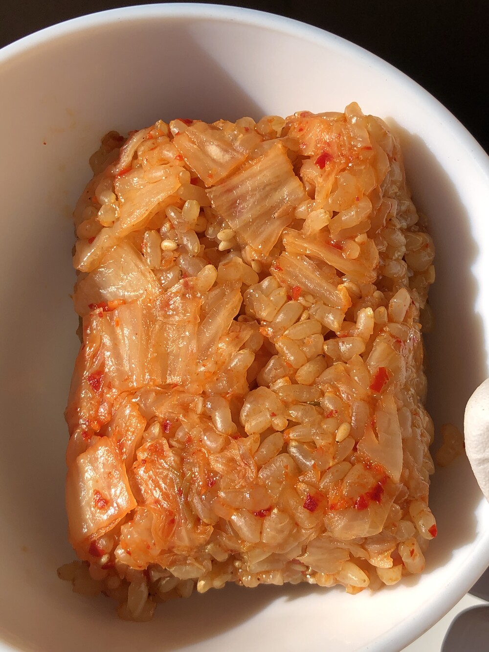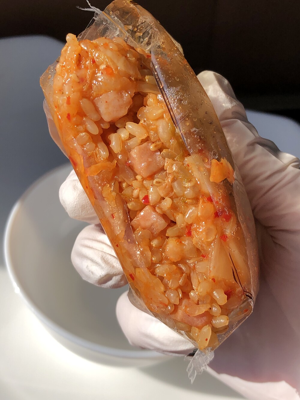 원재료명 : 찹쌀(국산)55% 스모크햄 20% {돼지고기84.6%[지방일부사용,외국산(미국,벨기에,스페인 등)-75%, 국산-25%] 정제수, 옥수수전분[옥수수:외국산(러시아 등)], 양파(국산),함수결정포도당, 정제소금, 오뗄스모크햄복합하이프로, 대두단백, 유청분말, 두잇복합인산염(혼합제제-폴리인산나트륨,메타인산나트륨,피로인산나트륨),하이브로1,난백분말,소브산칼륨(보존료),햄레드C(혼합제제-무수결정포도당,구연산삼나트륨,덱스트린,팽창제,코치닐추출색소),비타민C, 설탕, 백후루, 아질산나트륨 (발색제)} 소스[양조간장10% {탈지대두:외국산 (인도 미국 중국 등) 천일염(호주산) 소맥(미국산) 기타과당주정} 혼합간장28%{탈지대두:외국산(인도 미국 중국 등)} 정제소금 정제수 발효식초 마늘 다시마 미향 정백당 소고기육수분말 구연산(산도조절제5-리보뉴클레이티드이나트륨L-글루탐산나트륨(향미증진제)파라옥신안식향산에틸 대두 밀 함유) ] 김치20% {절임배추87%(국내산) 고춧가루3%(국내산)육수3.7%멸치젓1% 새우젓1% 마늘2% 생강0.5% 제재염1.3%} 백설탕0.5%} ,백설탕2% 참기름(중국산) 참깨(중국산) *돼지고기 함유