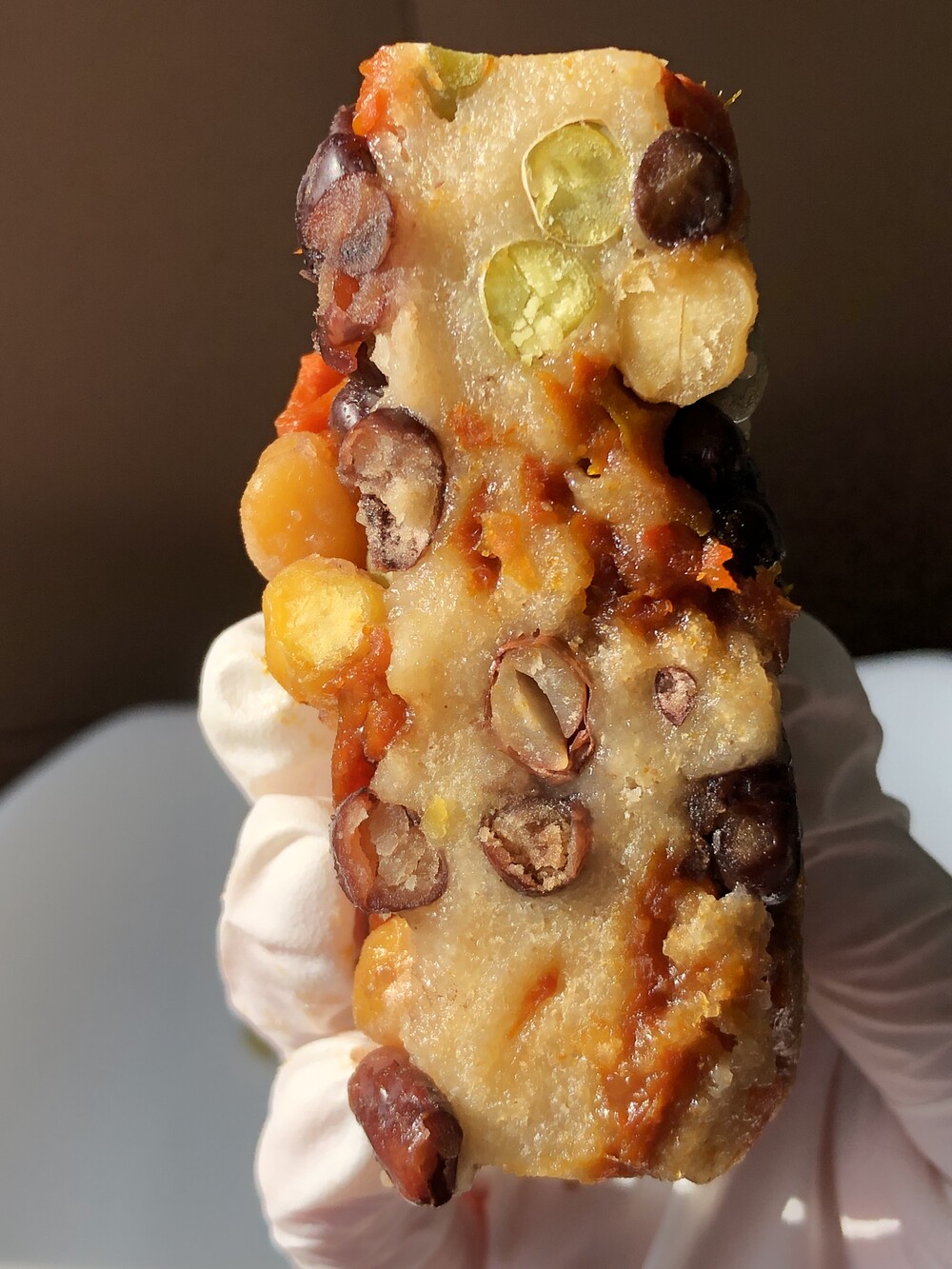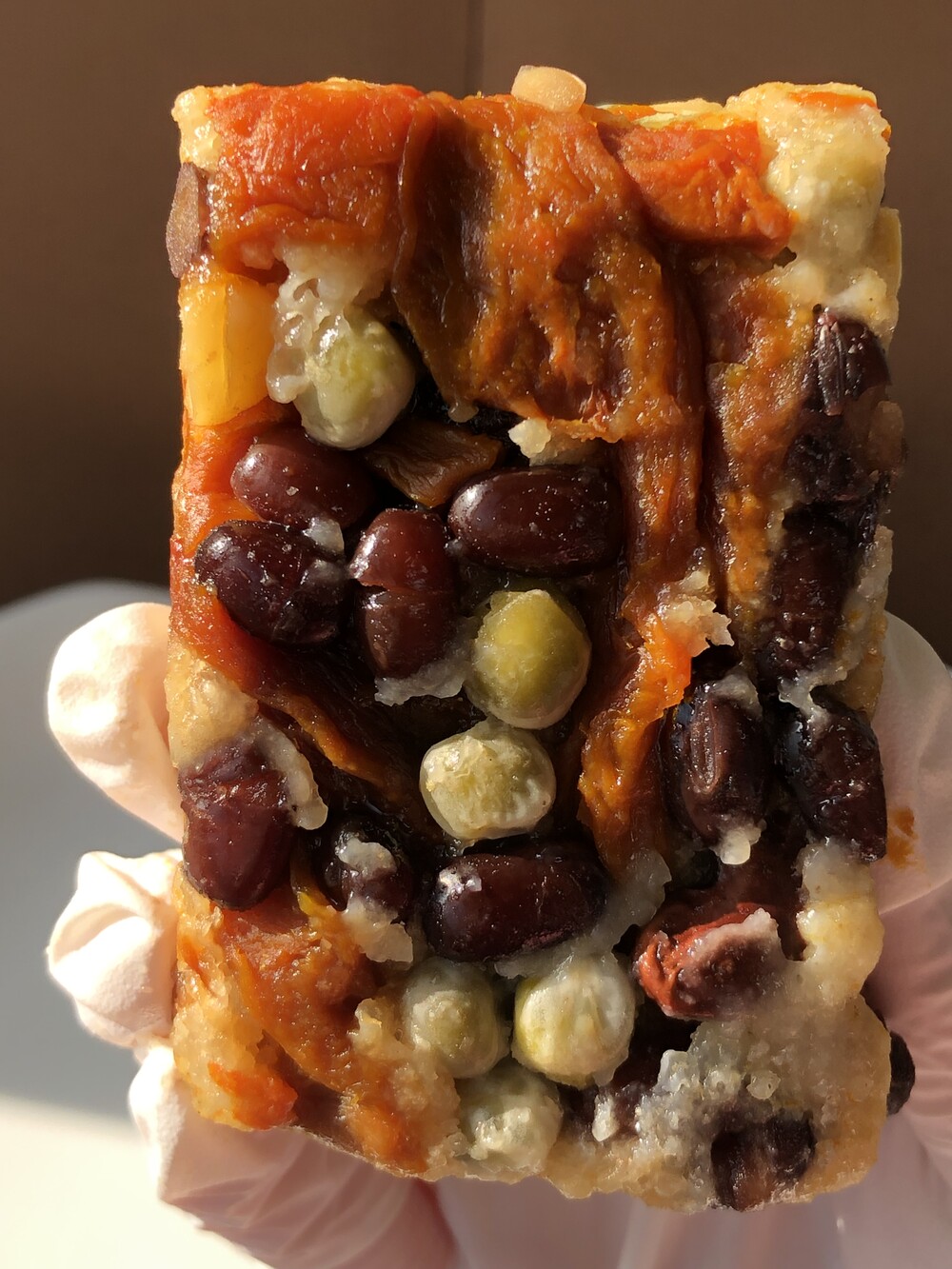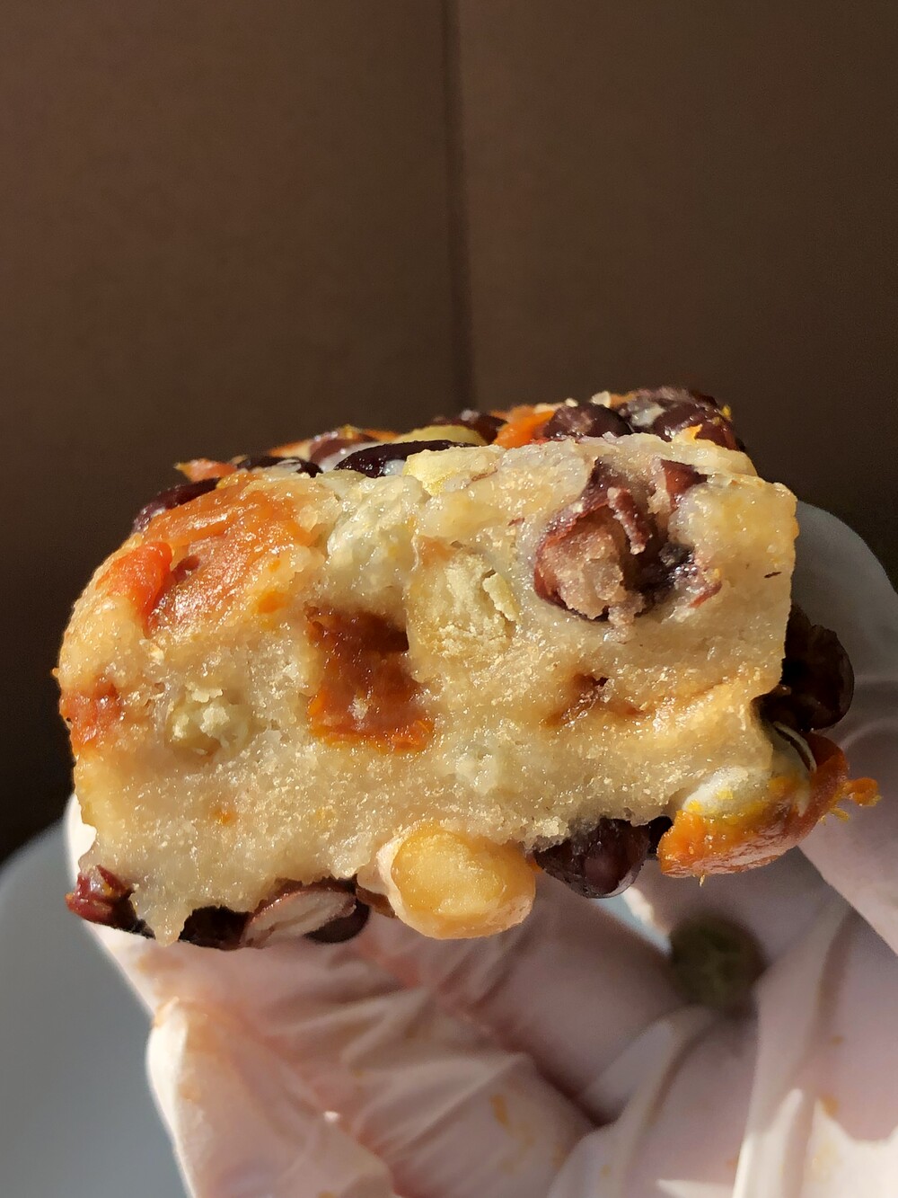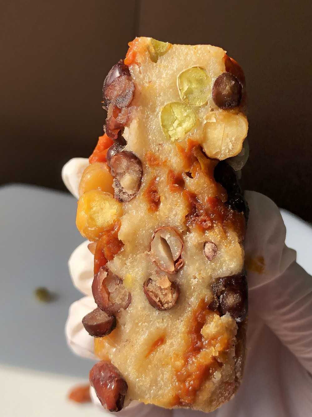 투박하고 퍽퍽한 느낌도 있으며 화려한 면도 있답니다. 콩이 톡톡 살아 있고 쫀득함과 탄력이 공존하는 식감이 특징이에요. 그리고 이 다채로운 재료들을 묵직하고 탄탄한 설기가 중심에서 단단히 받쳐 줍니다. 그래서 전체적으로 아주 조화롭습니다.
