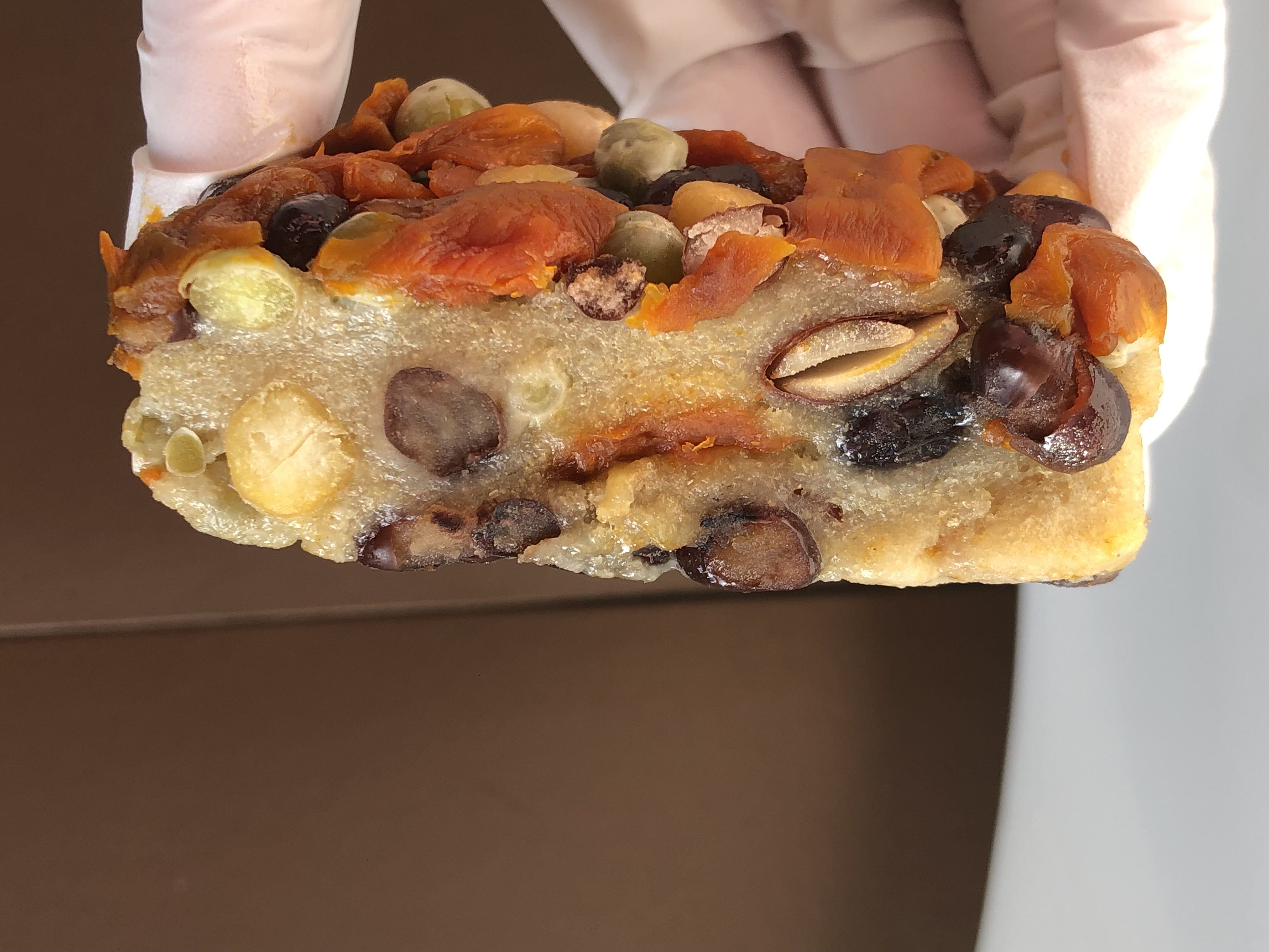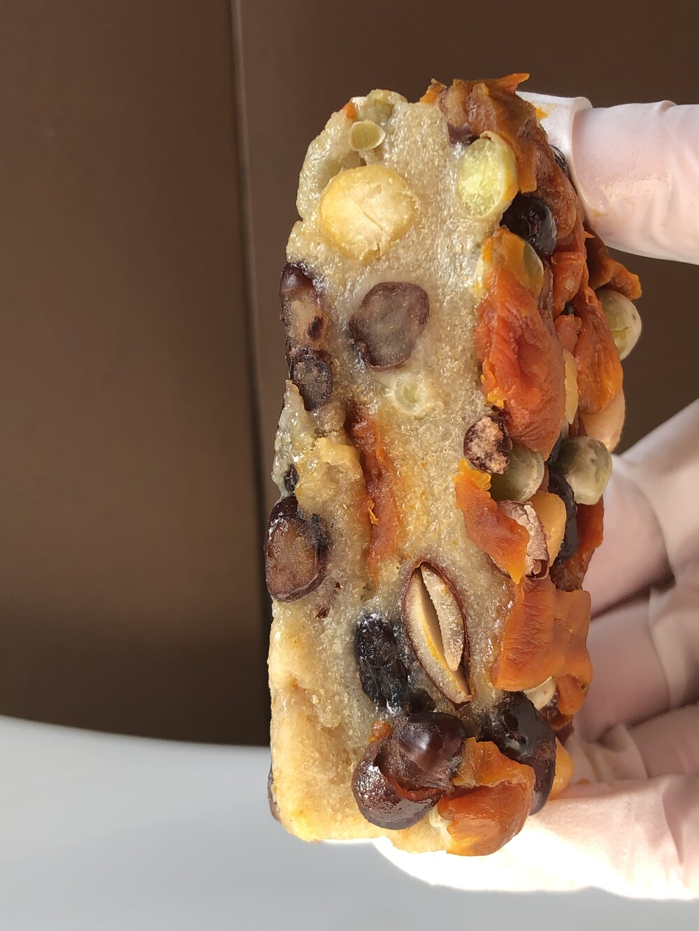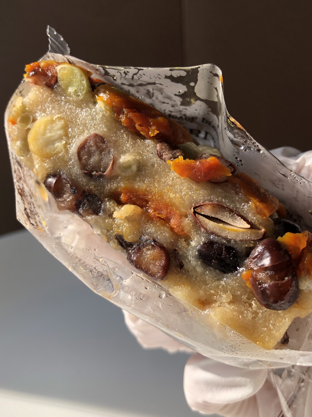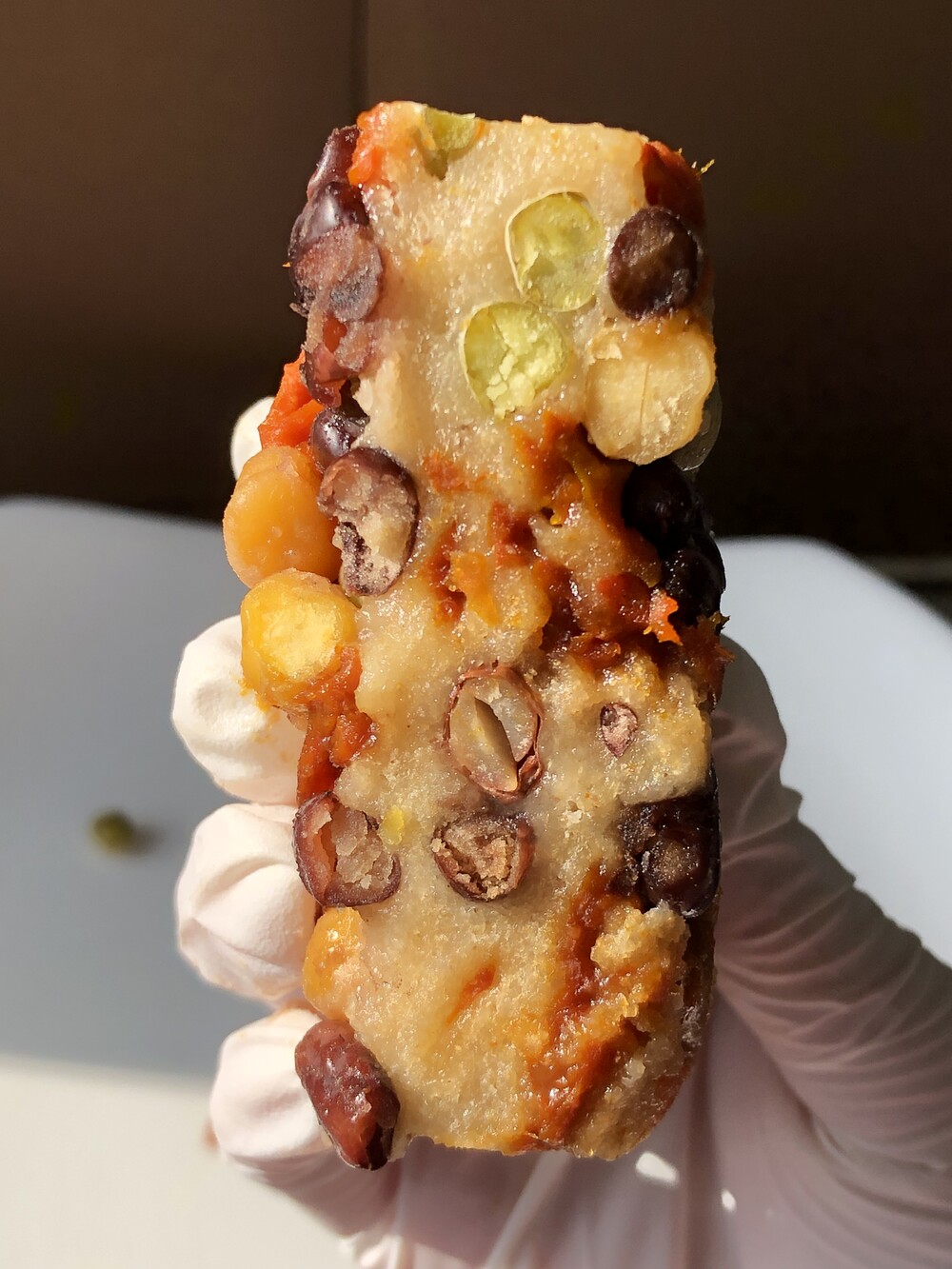 투박하고 퍽퍽한 느낌도 있으며 화려한 면도 있답니다. 콩이 톡톡 살아 있고 쫀득함과 탄력이 공존하는 식감이 특징이에요. 그리고 이 다채로운 재료들을 묵직하고 탄탄한 설기가 중심에서 단단히 받쳐 줍니다. 그래서 전체적으로 아주 조화롭습니다.