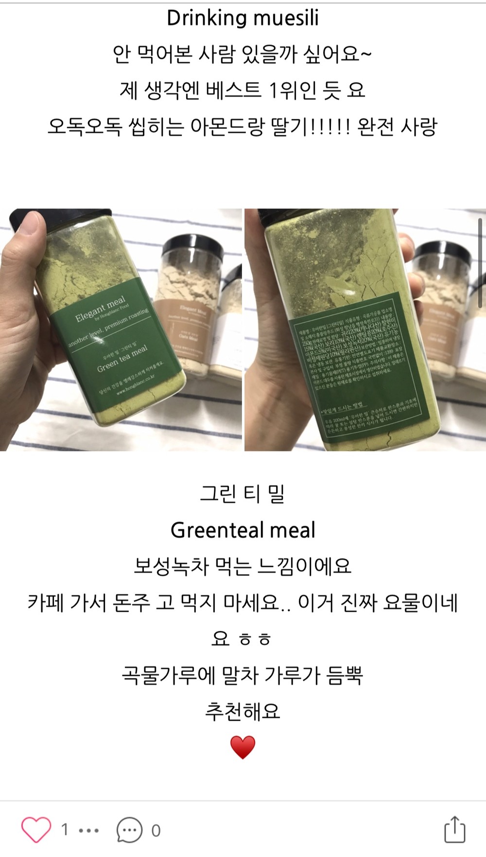 한끼 식사대용으로 꾸준하게 드시면 식단조절에 효과적이예요. 참 훌륭해요, 특히 임산부, 수유맘들께서 많이 찾아주시는 상품이예요. 저는 하루에 한번은 꼭 우아한밀 한잔을 먹어요. 버릇처럼, 당연해졌답니다.타 업체의 선식을 드셔보시다가 우아한 밀을 접하신다면 차별화된 고급스러운 풍부한 고소함과 부드러운 목넘김에 반하실거예요.