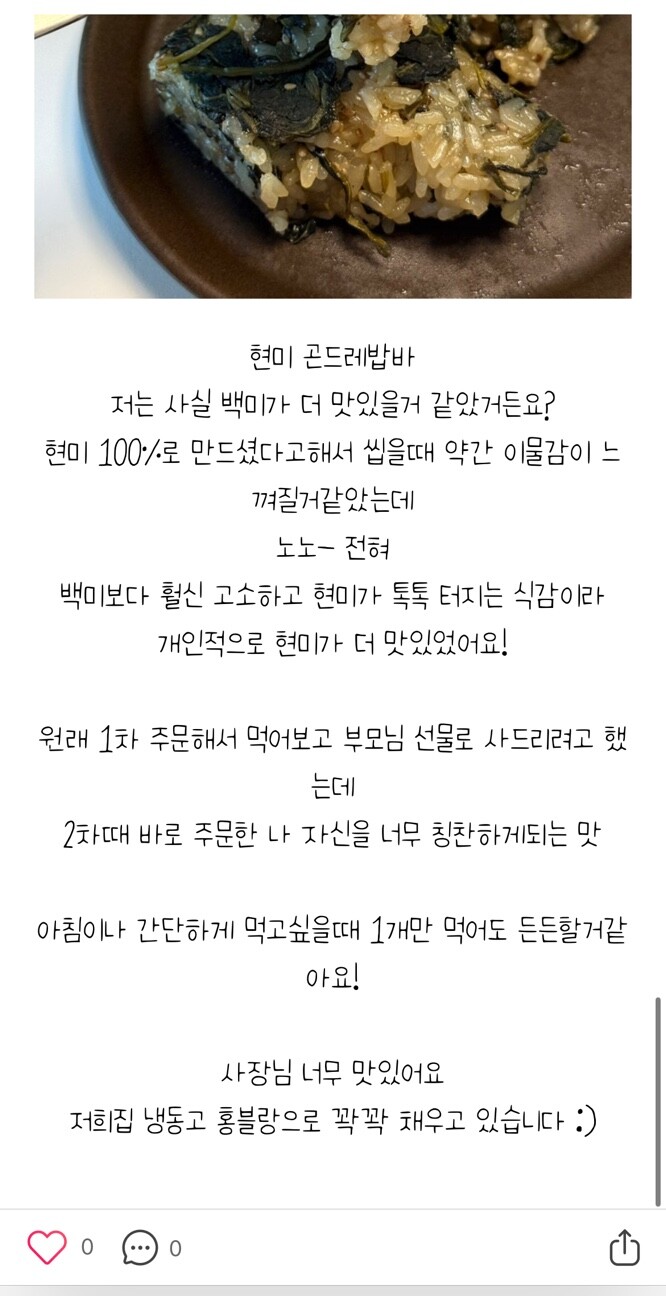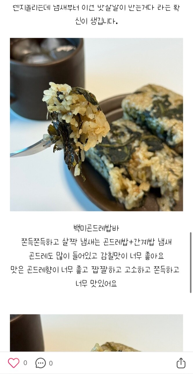 바쁠 때마다 저는 삼각 김밥을 주로 먹곤 하는데 입맛에 맞기 보다는 바쁜 일상 생활 속, 후딱 먹으려고 종종 먹는데 이와 홍블랑이 만든 곤드레밥 바와 비교하자면 아주 .. 저 괜찮은 칭찬 받을 것 같습니다. 그리 화려하지 않은데 시루로 잘 지어진 찰밥과 싱싱한 생 곤드레의 향긋함 그리고 별다른 기교없이 잘 표현한 소스가 이 찰밥과 곤드레 나물에 은은하게 잘 베어 감칠맛이 좋습니다. 이 와중에 정말 홍블랑스레 표현하기 위해 참기름도 작접 짜고 참깨도 직접 볶습니다. 그러기에 구수함이 더할 나위 없이 괜찮다고 감히 표현하게 되네요. 바쁘실 때, 렌지에 후딱 데워 기분 좋은 한 끼, 향긋한 한 끼로 드셨으면 합니다.