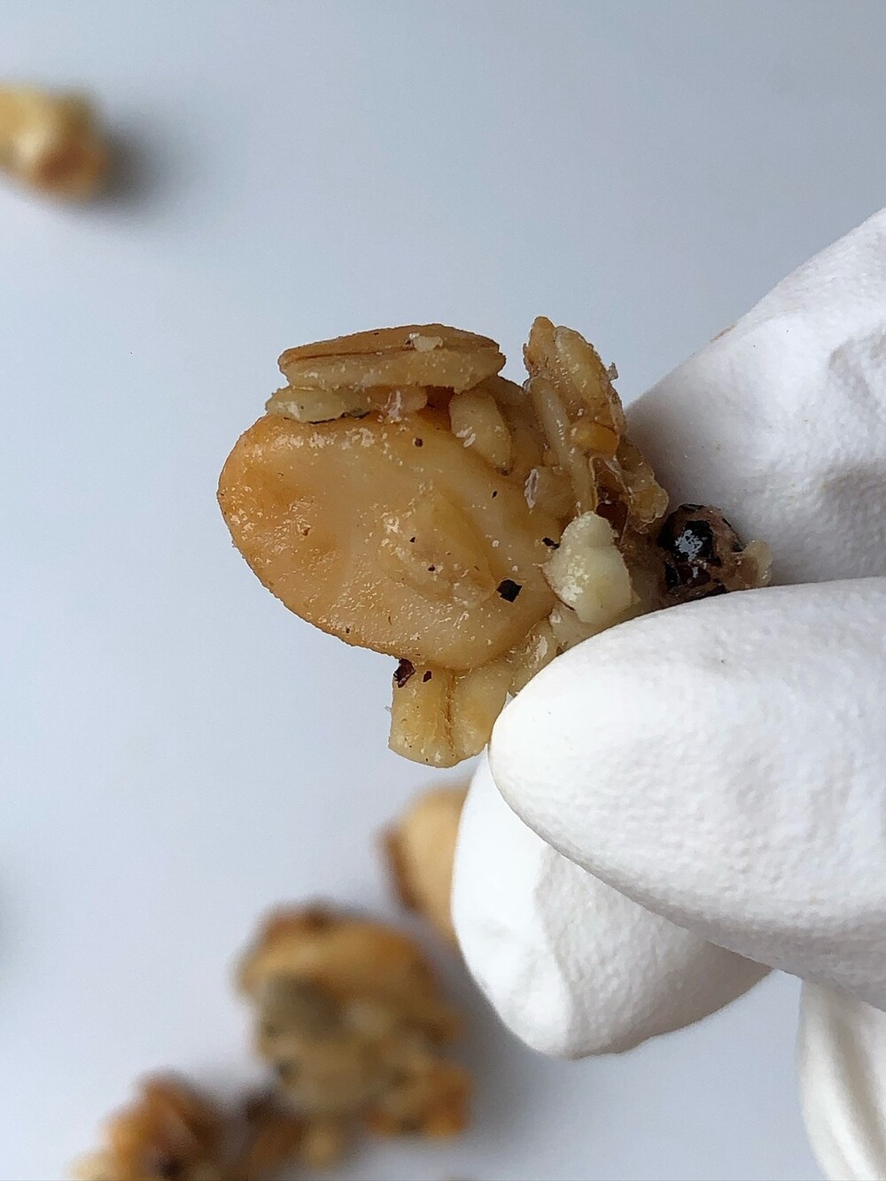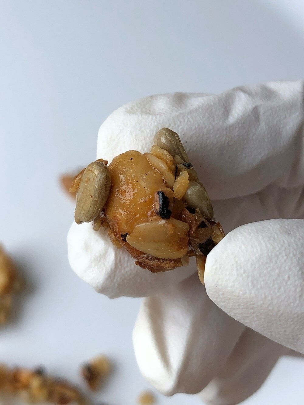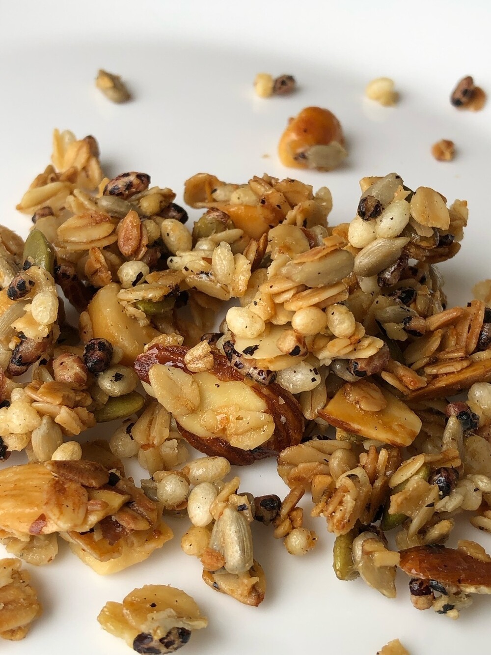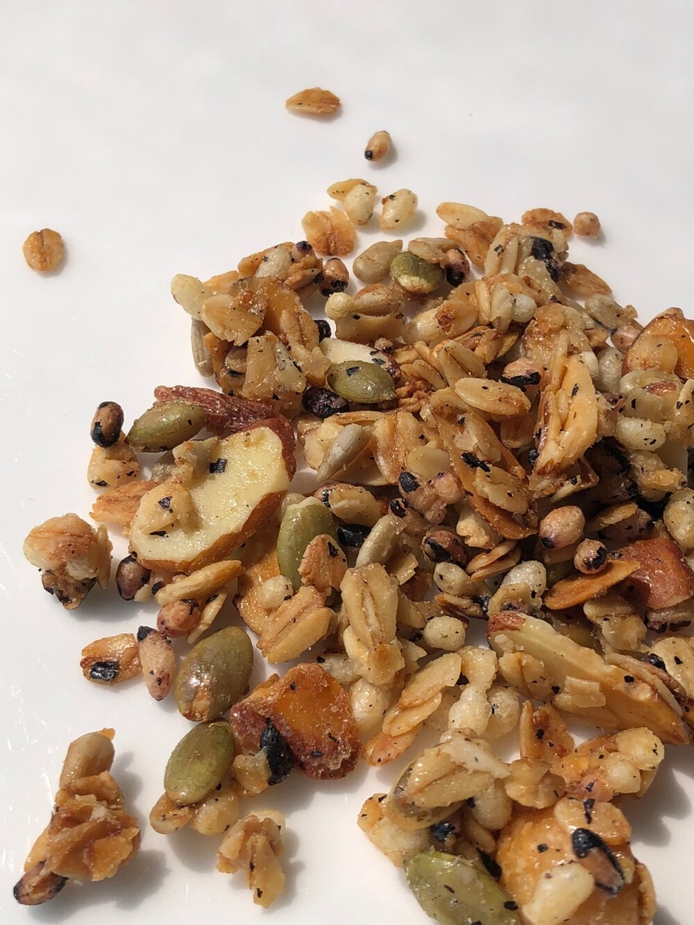 딱딱한 그래놀라보단 조금 더 부드럽고 건강하지만 풍성한 맛 그리고 곡물 하나하나에 특별한 자신감을 가지고 있는 그러한 그래놀라를 원하여 준비했는데 잘 완성된 것 같습니다. 은은한 버터 풍미가 아주 예술이고요. 고급스러운 달콤함은 국산 벌꿀과 유기농 아가베 시럽과 프락토 올리고당으로 표현하였습니다.