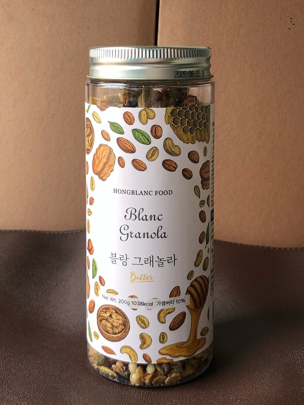 제품명 블랑 그래놀라 내용량 200g 원 재료명 압착귀리(미국산) 아몬드 슬라이스(미국산) 가염버터(유크림,식염,젖산스티터컬쳐) (프랑스산) 해바라기씨앗, 프락토올리고당, 마카다미아. 호박씨앗, 벌꿀(국산) 유기농아가베시럽, 올벼쌀플레이크(국산) 흑미플레이크(국산),올리브유
