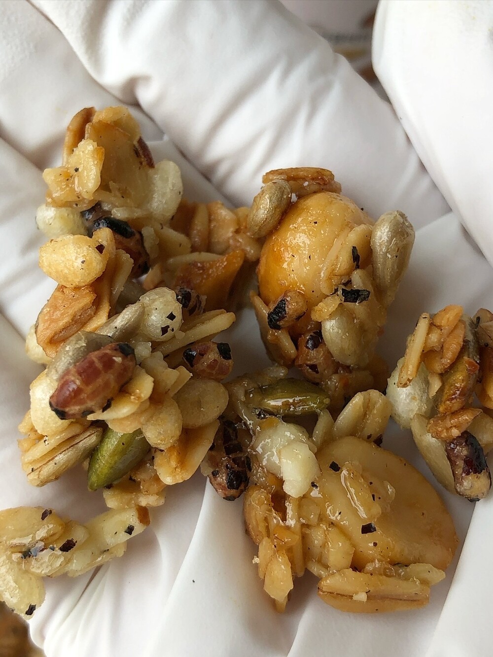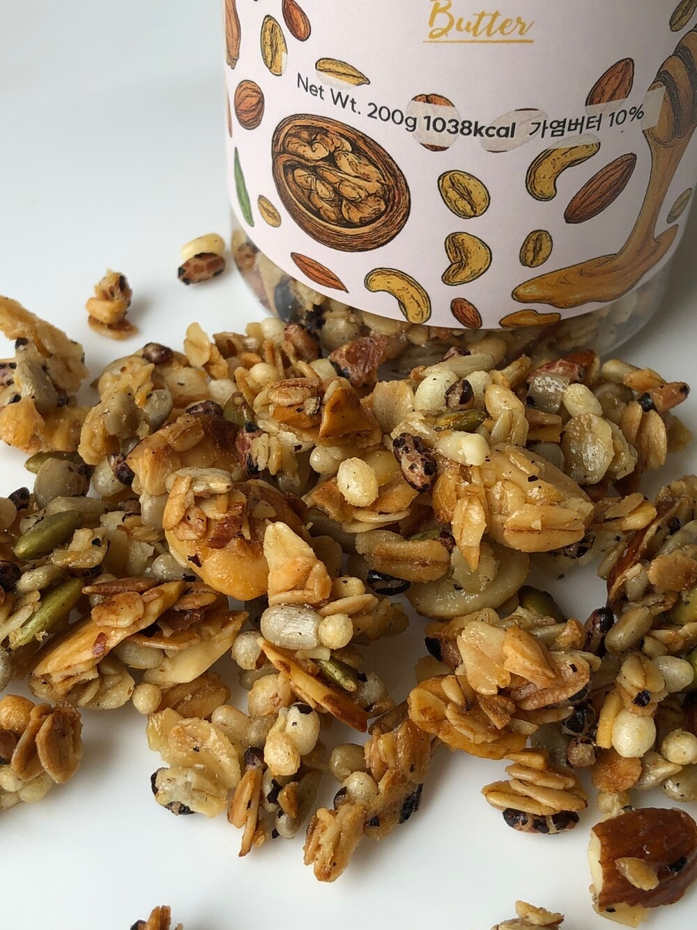 도톰하게 뭉친 귀한 재료들을 오븐에 직접 구워서 만든 수제 그래놀라랍니다. 재료 하나하나 섬세하게 셀렉하였지요. 이 셀렉한 재료들 뭐 하나 빠짐없이 섬세하게 다루어 식감과 풍미가 함께 잘 어우러지도록 하였습니다. 견과류나 곡물의 고소함이 참 좋은데 여기에 가염 버터를 살짝 넣어 볶으니 풍미가 너무 고급스럽습니다.