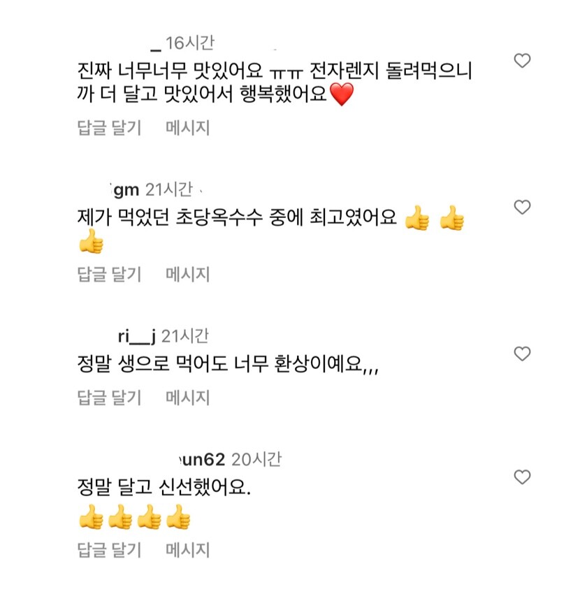 초당 옥수수는 원래 맛있어요. 초당이잖아요. 근데 그냥 맛있으면 제가 보여드리지 않았을 거예요. 정말, 완벽하게 훌륭하게, 아주 특별하여 정말 맛있어서 잊히지 않는 그럼 초당 옥수수를 찾고 있었거든요. 딱, 찾았고요. 완벽하게 홍블랑스타일이라 꼭 보여드리고 싶었습니다. 이 맛, 꼭 전달해 드리고 싶어요.