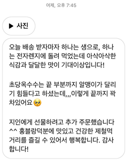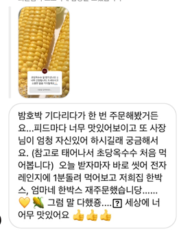 모든 초당 옥수수라고 해서 맛의 농도와 당도가 같지 않습니다. 같은 농가에서 나오는 원물이라고 해서 모두 같지 않죠. 굉장히, 아주 깐깐한 제가 직접 조르고 졸라 받게 된 초당 옥수수이기에 자부합니다.