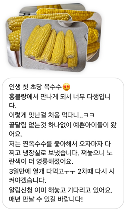 지금 가장 맛있는 시기입니다. 이 시기를 얼마나 손꼽아 기다렸는지 몰라요. 미리 선보이고 싶었지만 이 당도를 위해 기다렸습니다. 초당 옥수수의 시즌은 매우 짧아요. 그렇기에 가장 맛있을 때, 이맘 때 꼭! 놓치지 마시고 드셔보시면 좋을 것 같아요. 시즌 상품이기에 귀하신 분들에게 선물해 주세요.