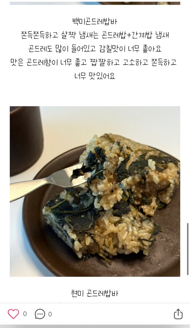 바쁠 때마다 저는 삼각 김밥을 주로 먹곤 하는데 입맛에 맞기 보다는 바쁜 일상 생활 속, 후딱 먹으려고 종종 먹는데 이와 홍블랑이 만든 곤드레밥 바와 비교하자면 아주 .. 저 괜찮은 칭찬 받을 것 같습니다. 그리 화려하지 않은데 시루로 잘 지어진 찰밥과 싱싱한 생 곤드레의 향긋함 그리고 별다른 기교없이 잘 표현한 소스가 이 찰밥과 곤드레 나물에 은은하게 잘 베어 감칠맛이 좋습니다. 이 와중에 정말 홍블랑스레 표현하기 위해 참기름도 작접 짜고 참깨도 직접 볶습니다. 그러기에 구수함이 더할 나위 없이 괜찮다고 감히 표현하게 되네요. 바쁘실 때, 렌지에 후딱 데워 기분 좋은 한 끼, 향긋한 한 끼로 드셨으면 합니다.