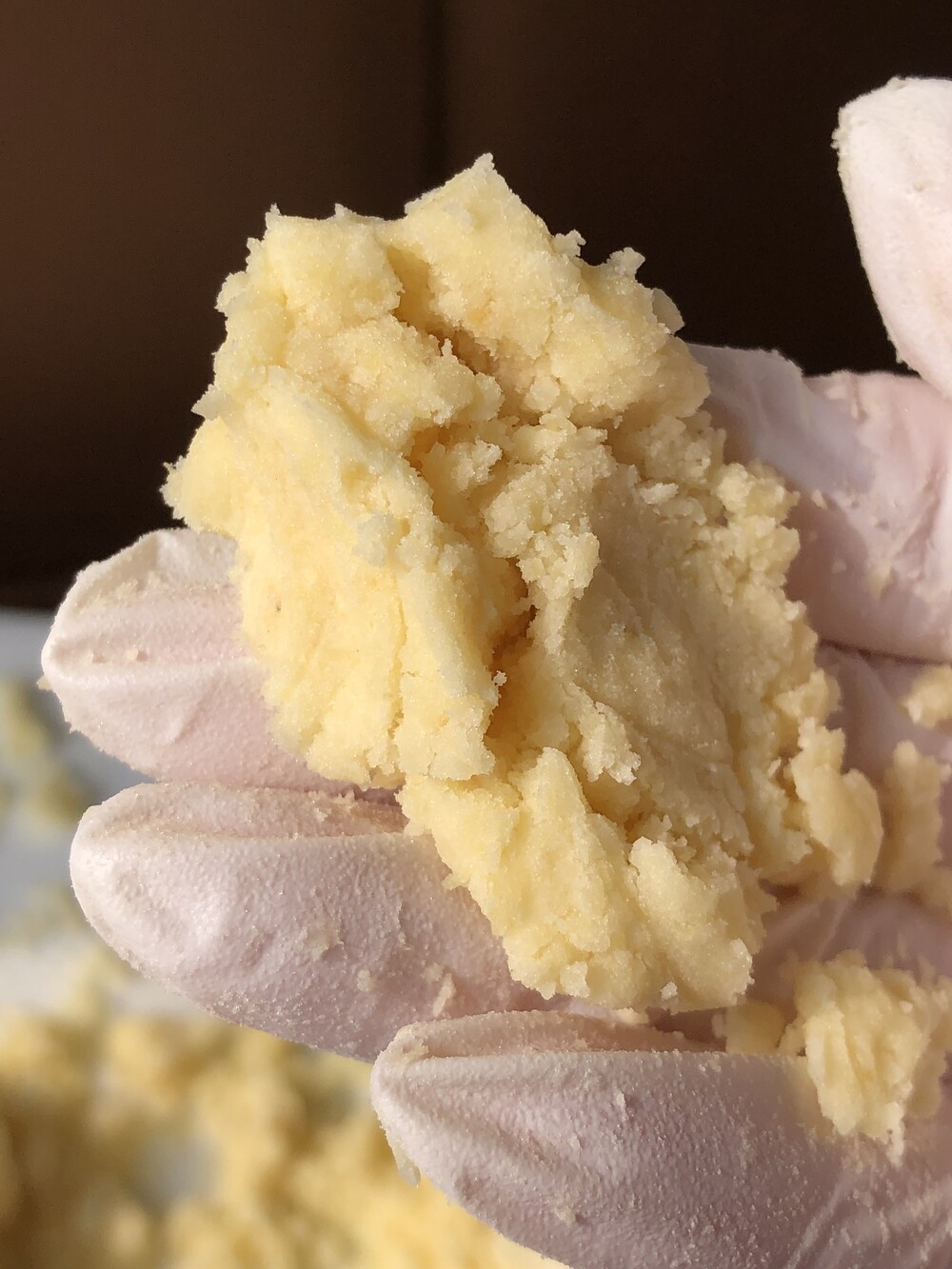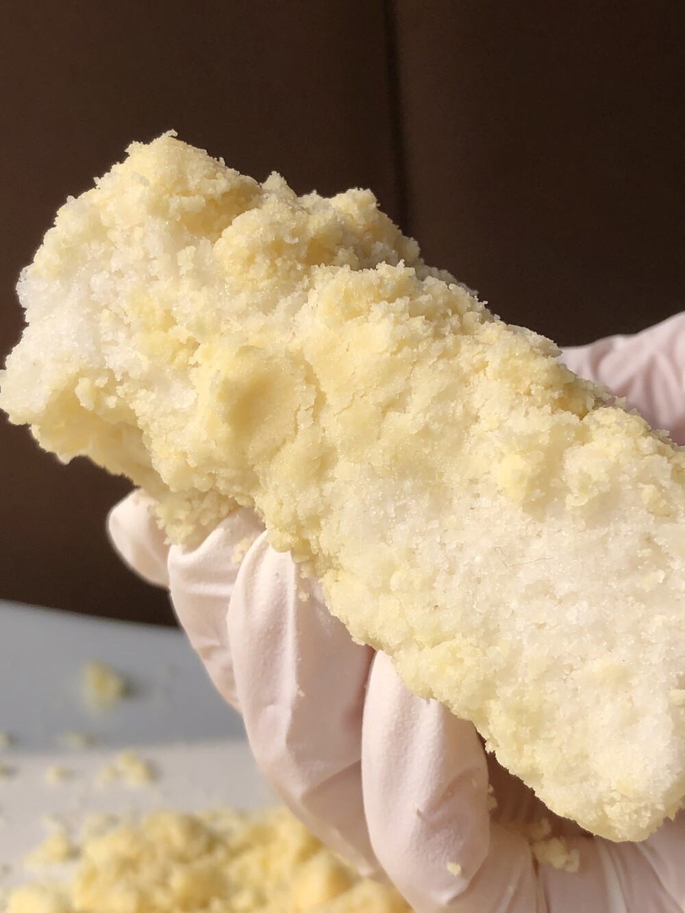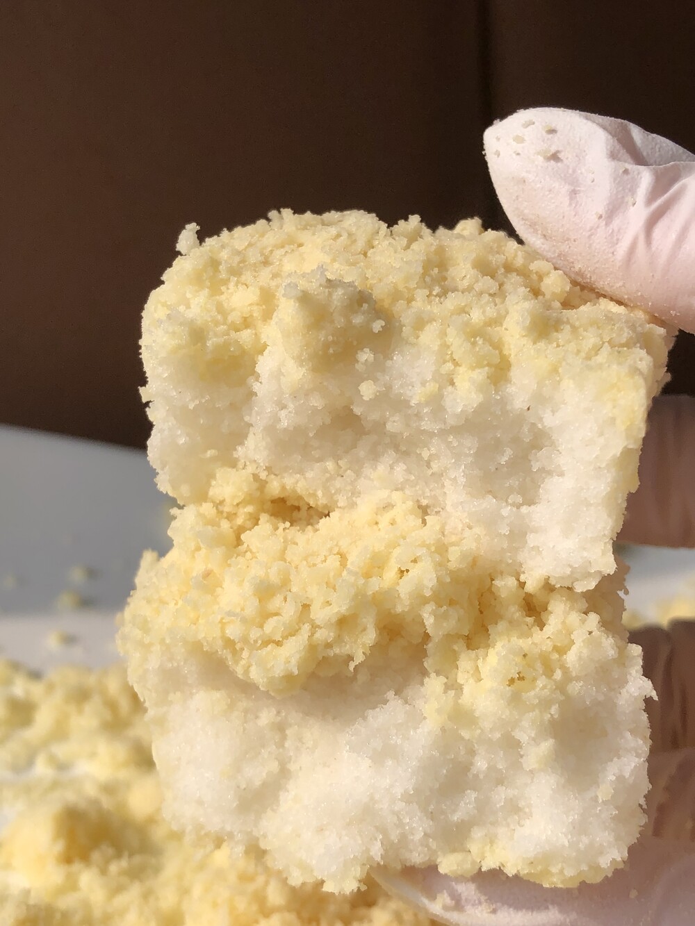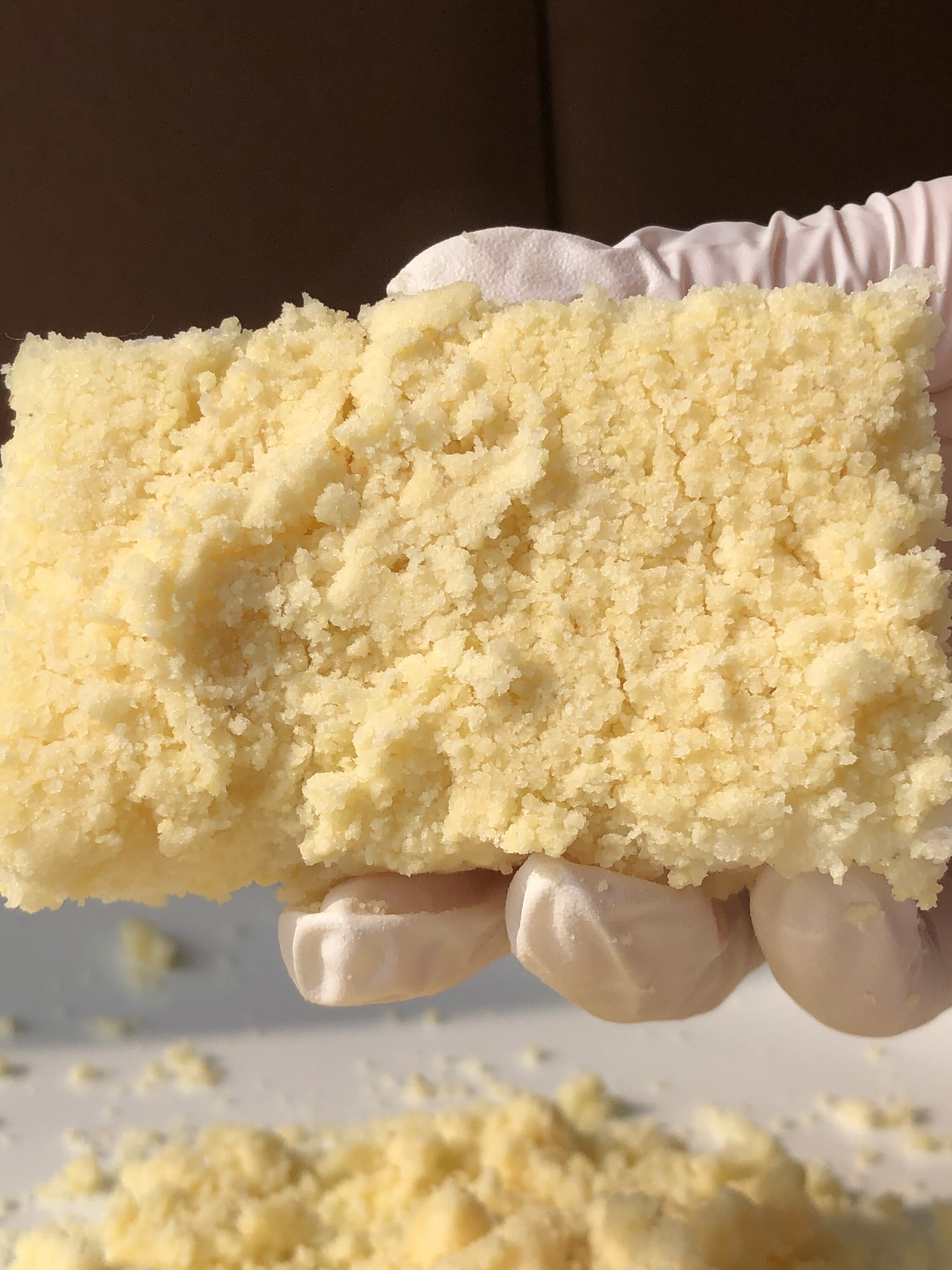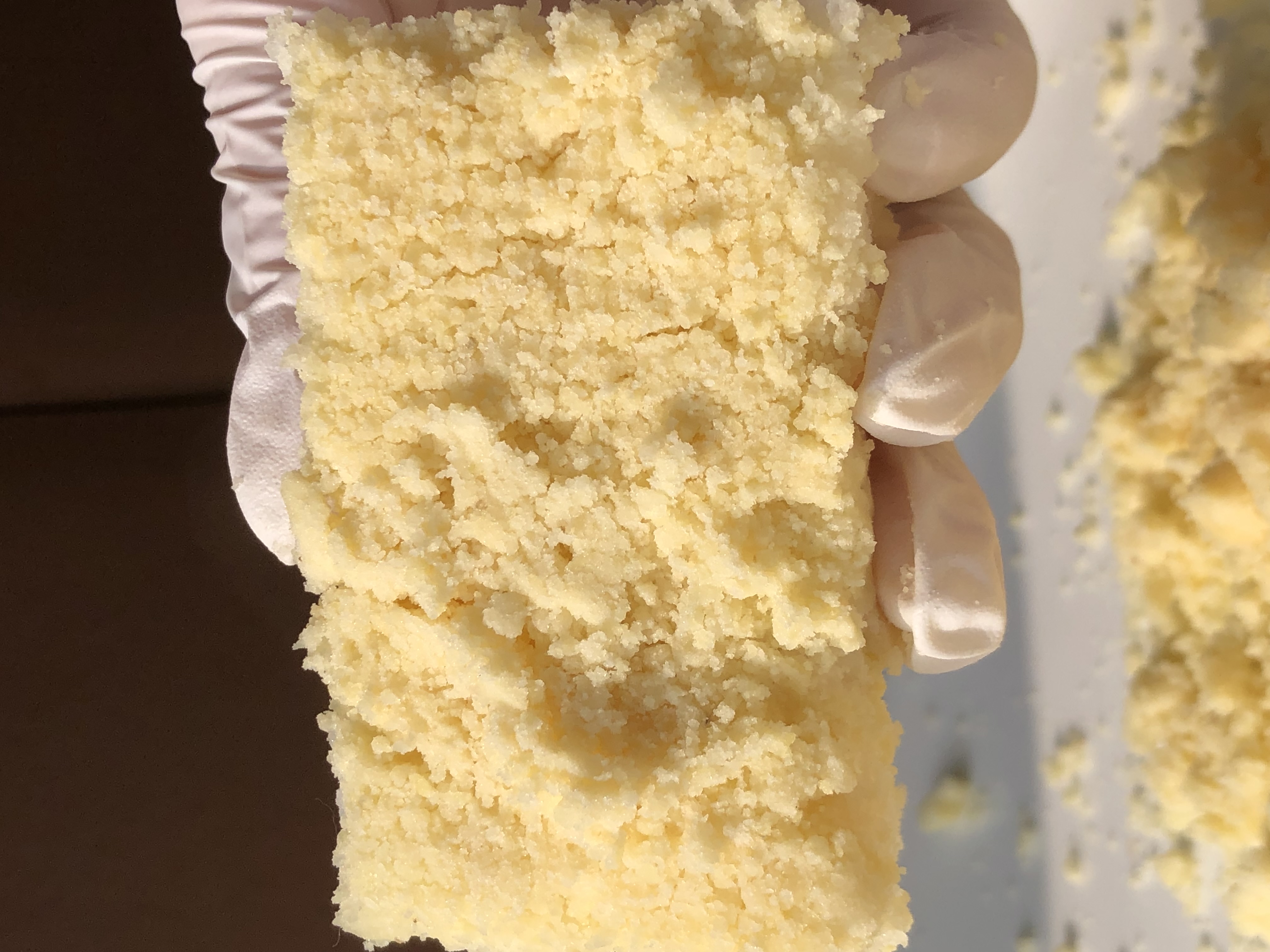 동부와 녹두를 정확히 반반 배합해 아주 곱고 보드랍게, 촉촉할 정도로 직접 빻아 사용합니다. 요즘에는 좀처럼 보기 힘든 방식이지만, 홍블랑은 여전히 방앗간 방식을 고집합니다. 이렇게 해야만 담백하면서도 깊은 고소함, 그리고 입안에서 사르르 녹는 부드러움이 완성되기 때문입니다. 카스테라 빵가루처럼 촉촉한 텍스처랍니다.