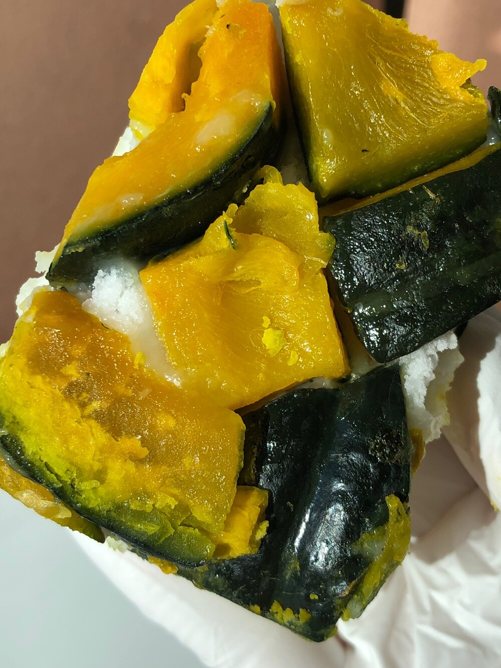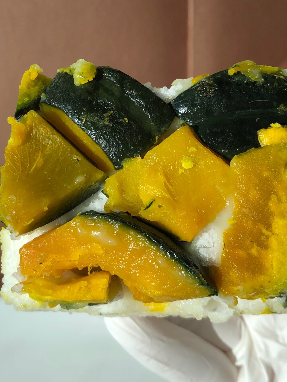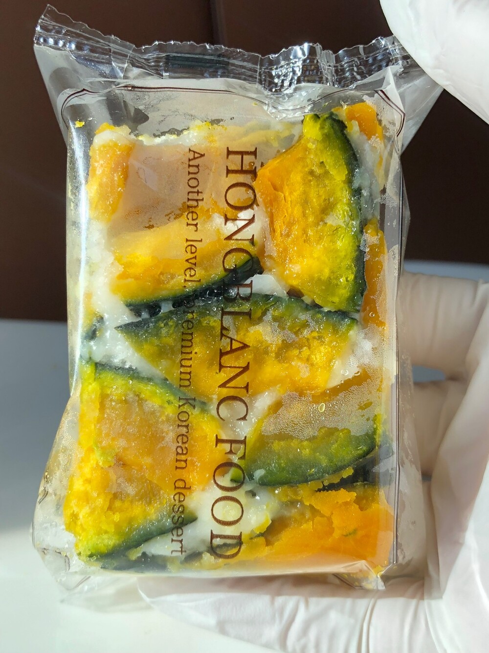 상품명: 호박설기 식품유형:떡류 업소명:홍블랑푸드 내용량: 1box (한팩90g±5g) 12팩 원재료명 및 함량 : 멥쌀(국산)50% 밤호박(뉴질랜드산)40% 설탕5% 천일염1% 정제수
