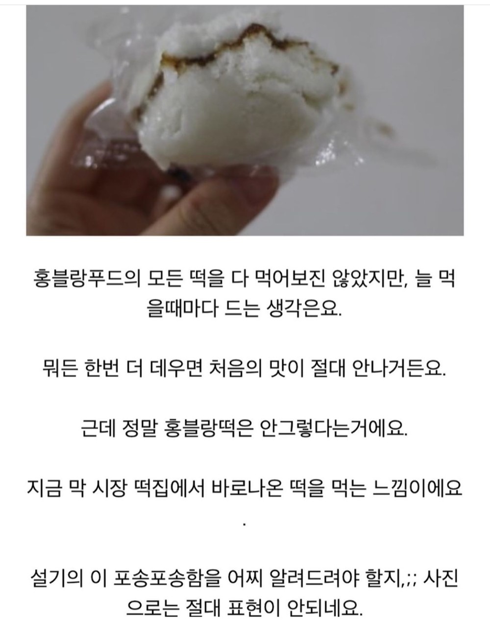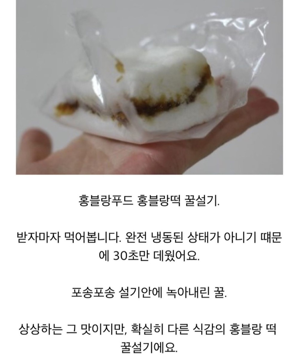 받으신 떡은 바로 드실 수 있는 상품이 아닙니다. 냉동입니다. (부득이하게 날씨로 인해 살짝 녹을 수도 있어요. 하지만 수분량을 조절하고 있고 아이스팩 아이스박스를 사용하는지라 걱정하지 않으셔도 되어요)