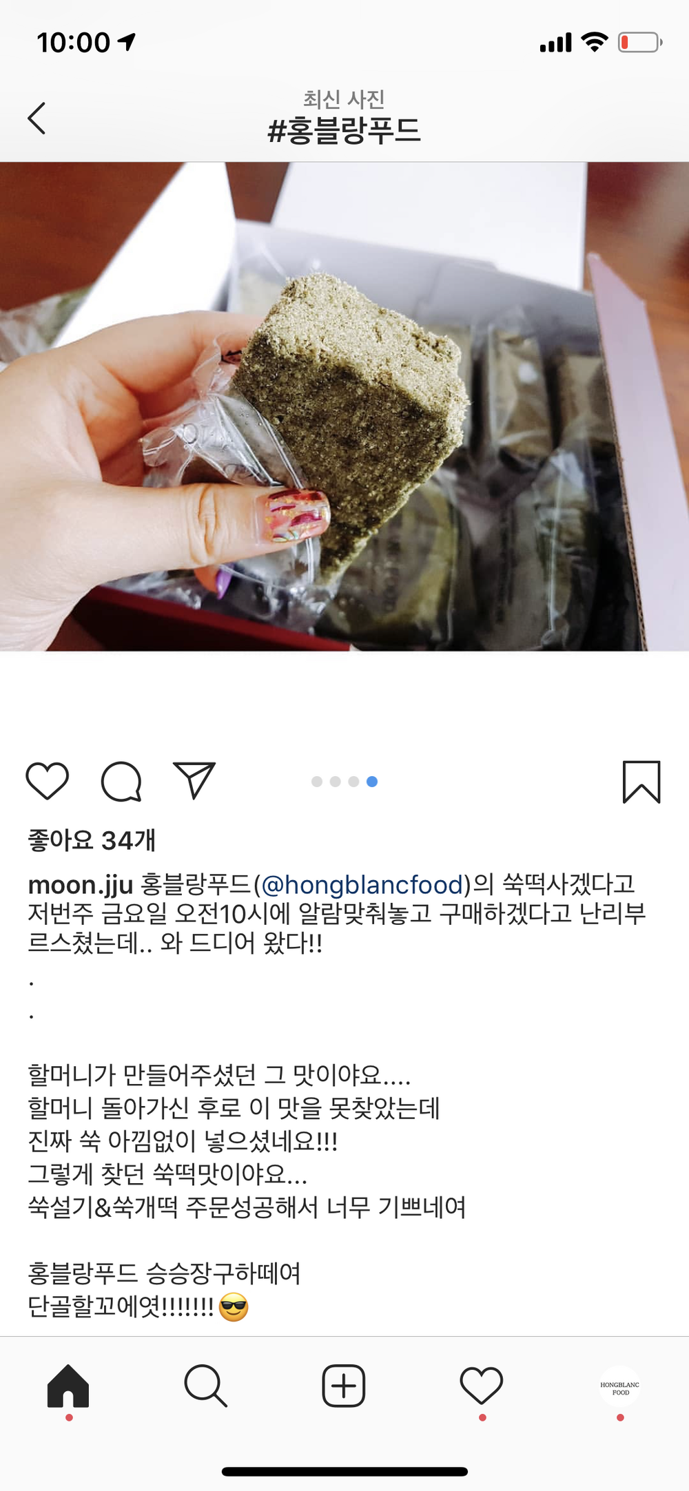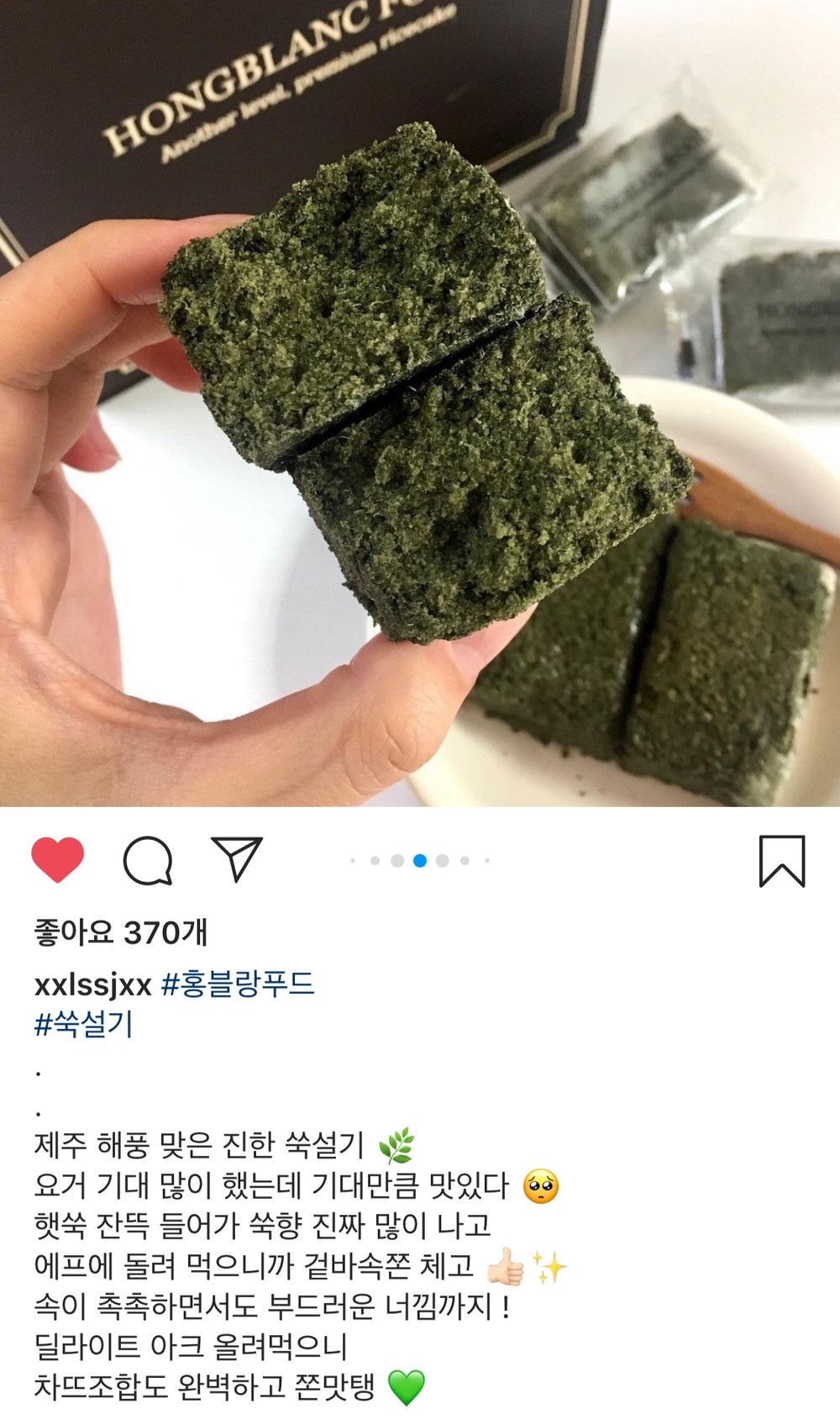 상품명: 쑥풍미 가득한 쑥설기 식품유형:떡류 업소명:홍블랑푸드 내용량: 1box (한팩80g±10g) 12팩 1kg 100g 내외 원재료명 및 함량 : 멥쌀(국산)55% 쑥(국산)35% 정제염 설탕 정제수 유통기한 : 제조일로 부터 3개월
