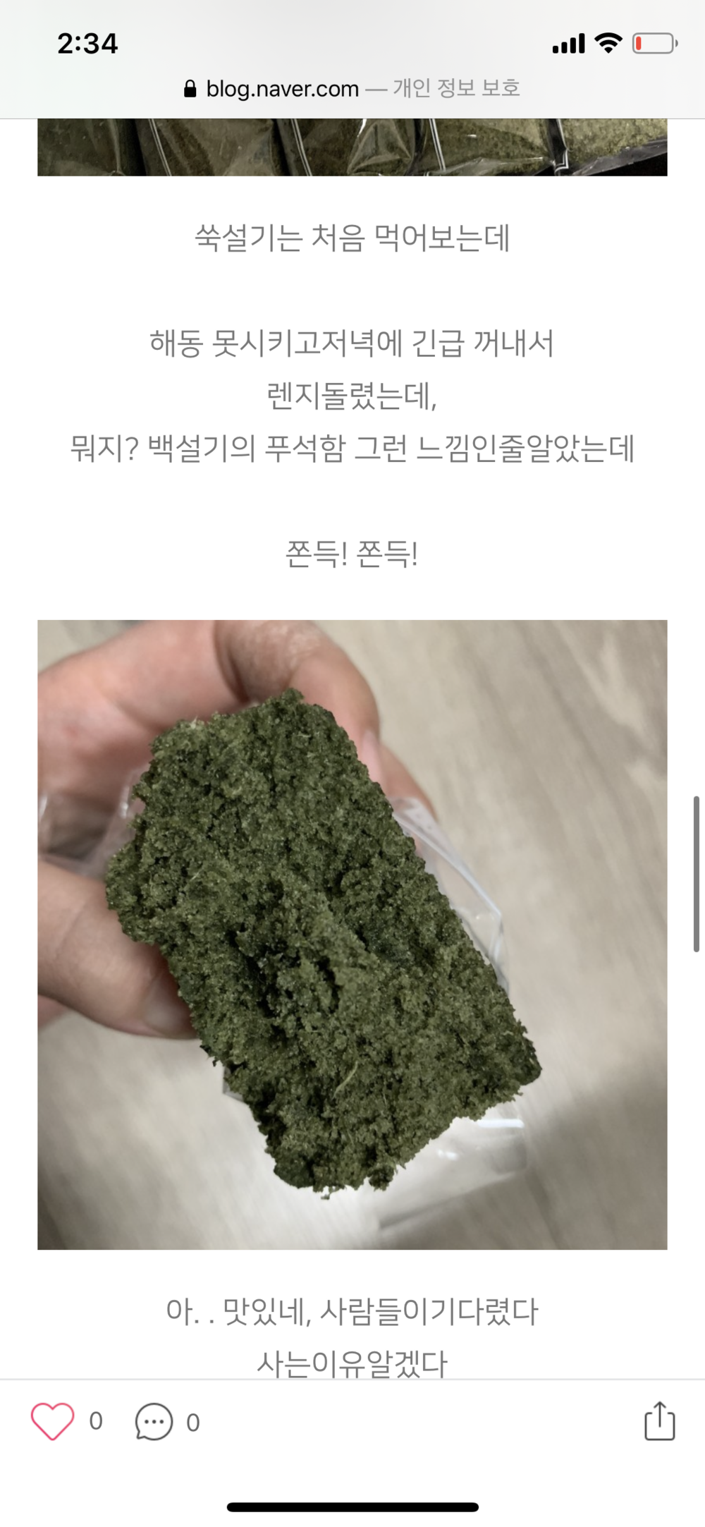일부 쌓는 과정에서 많은 분쇄가 되지 않아 쑥 줄기, 또는 빻으면서 생기는 쑥심지의 쑥가루 등 씹히는 식감이 있을 수 있다는 점, 참고 부탁드립니다.