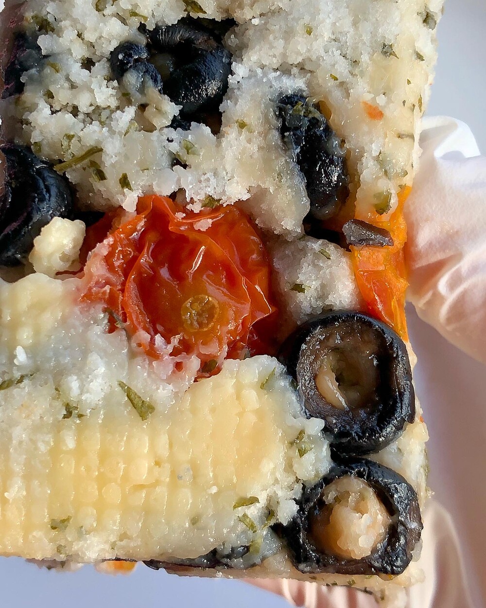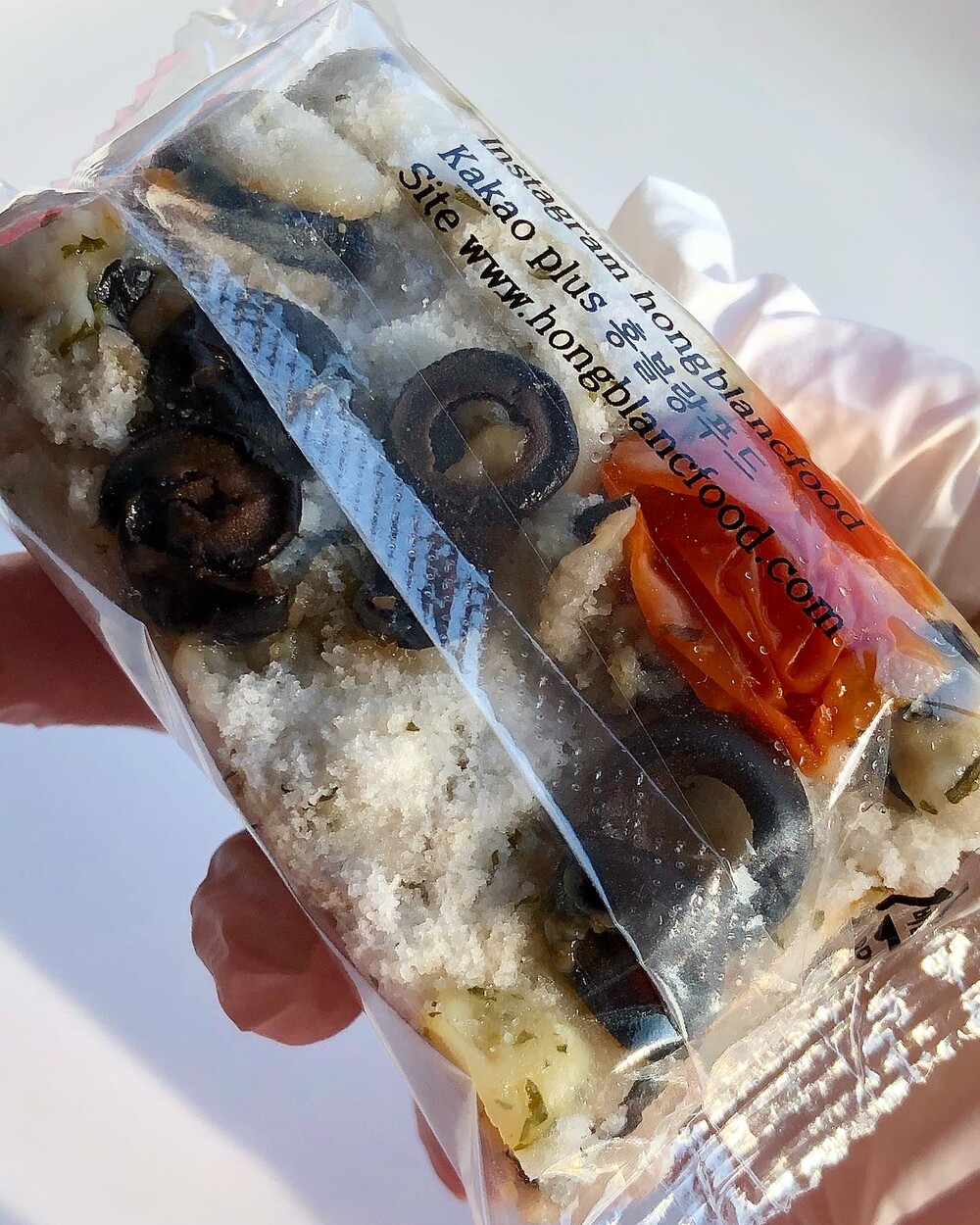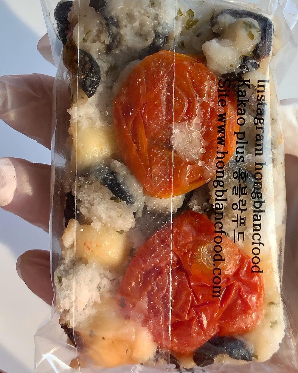 쌀가루에 같은 재료만 넣는다고 각 재료의 풍미며 식감이 홍블랑푸드의 나폴리설기와 같을 수 없어요. 이 본연의 재료 각각 식감과 풍미가 다르기에 다뤄야 하는 방식도 다른데요. 여기서 올리브의 탱글탱글하지만 촉촉함을 잘 살려야 하며 체리 토마토는 너무 무르지 않게, 단 이 매력적인 상큼함과 달큰함이 떡에 베어들지 않고 완성된 후에도 이 풍미 그대로, 여기에 치즈는 스르르 녹지만 이 치즈의 담백함이 떡에 스며들지 않게 부분부분 담백하고 고소함을 줄 수 있도록. 파슬리는 풍미 자체가 진하게 때문에 너무 과하게 넣으면 다른 재료의 풍미를 방해할 수도 있고 너무 적게 넣으면 깔끔한 포카치아가 아닌 조잡한 포카치아를 만들 수 있어 아주 적절하게 배합한 홍블랑푸드의 스킬로 넣었답니다.