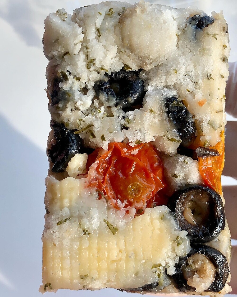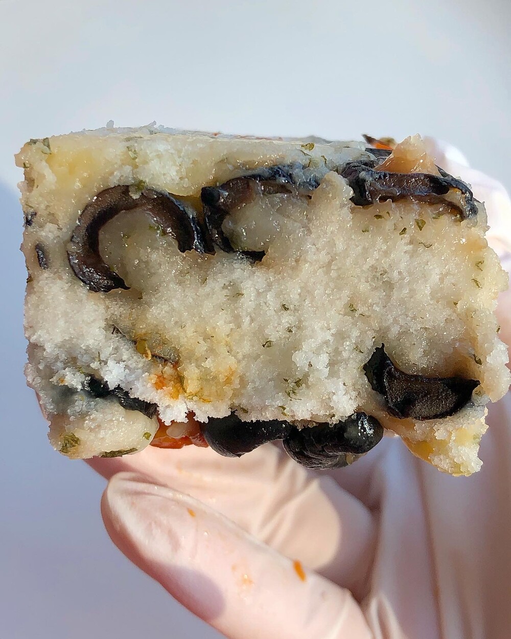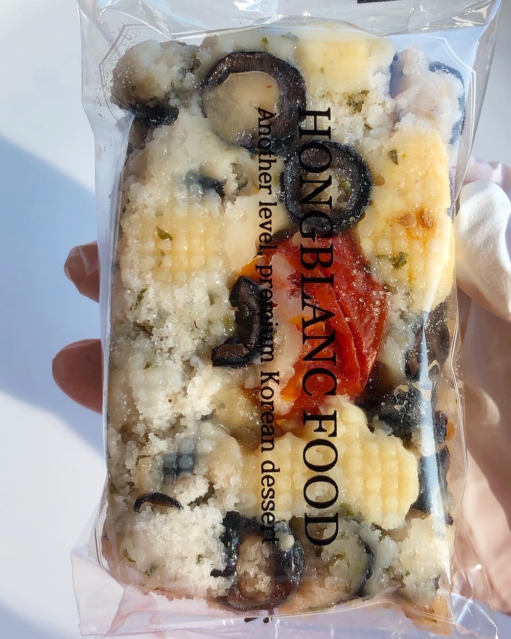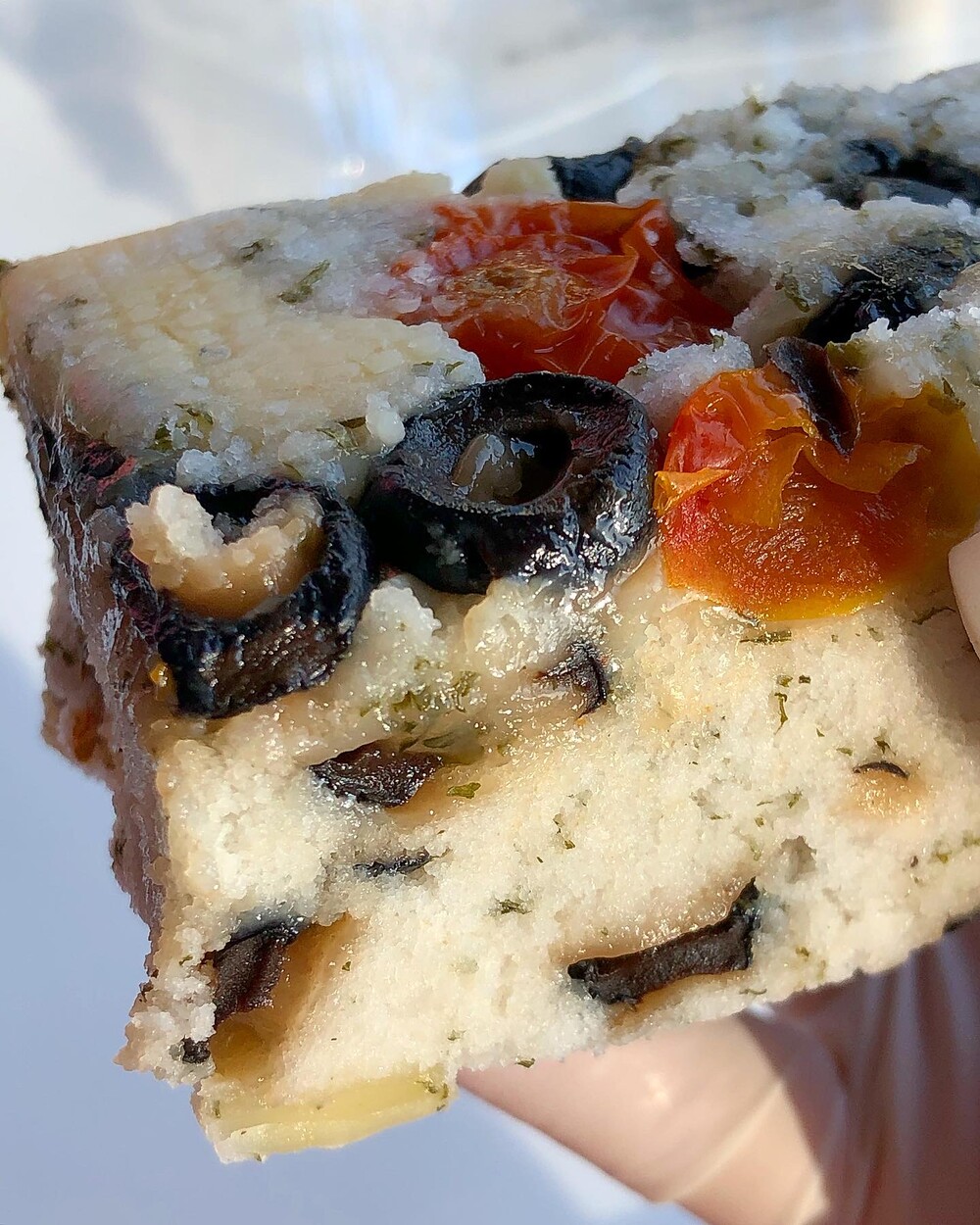 쌀가루에 같은 재료만 넣는다고 각 재료의 풍미며 식감이 홍블랑푸드의 나폴리설기와 같을 수 없어요. 이 본연의 재료 각각 식감과 풍미가 다르기에 다뤄야 하는 방식도 다른데요. 여기서 올리브의 탱글탱글하지만 촉촉함을 잘 살려야 하며 체리 토마토는 너무 무르지 않게, 단 이 매력적인 상큼함과 달큰함이 떡에 베어들지 않고 완성된 후에도 이 풍미 그대로, 여기에 치즈는 스르르 녹지만 이 치즈의 담백함이 떡에 스며들지 않게 부분부분 담백하고 고소함을 줄 수 있도록. 파슬리는 풍미 자체가 진하게 때문에 너무 과하게 넣으면 다른 재료의 풍미를 방해할 수도 있고 너무 적게 넣으면 깔끔한 포카치아가 아닌 조잡한 포카치아를 만들 수 있어 아주 적절하게 배합한 홍블랑푸드의 스킬로 넣었답니다.