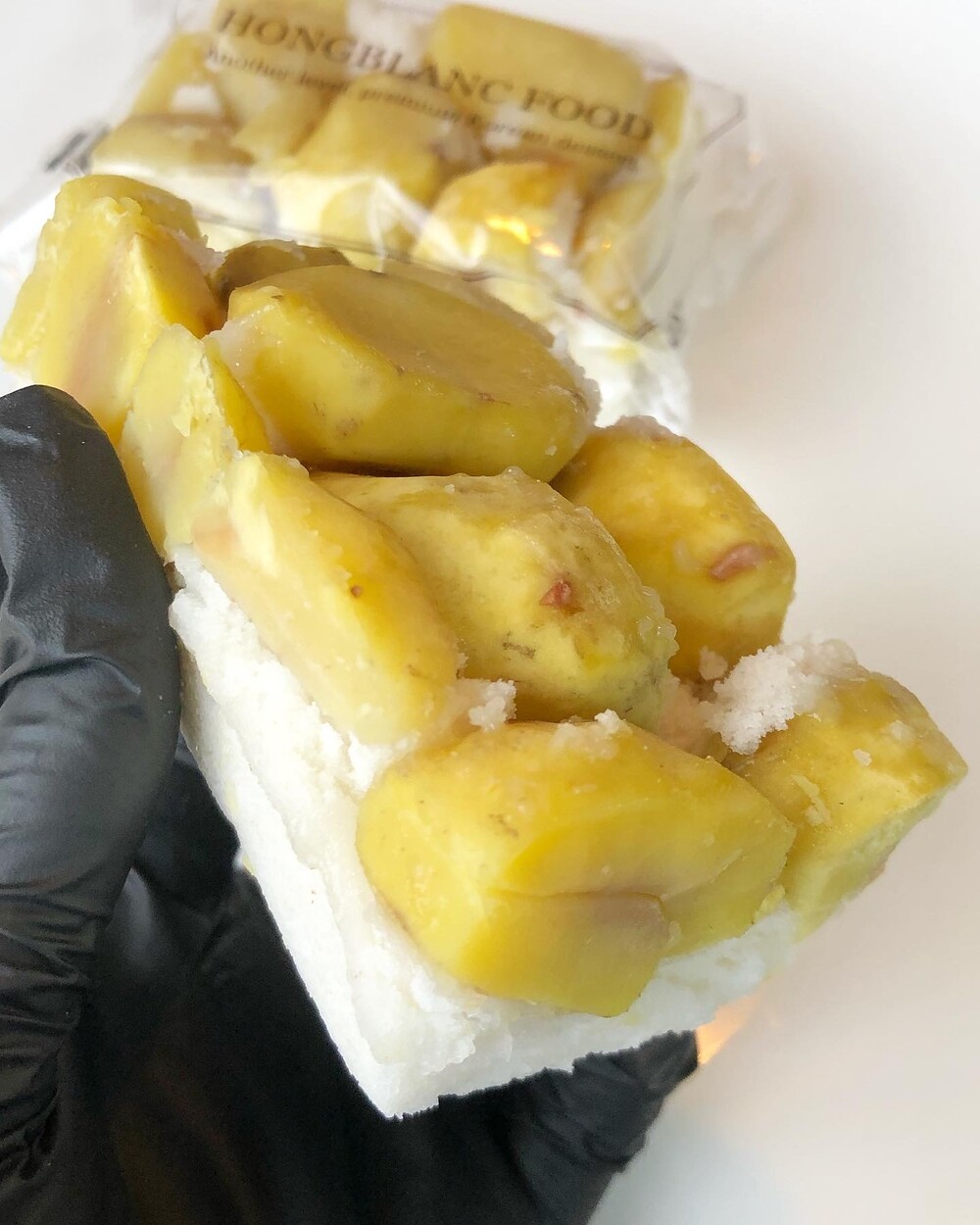 상품명: 공주밤 잔뜩 가을설기 식품유형:떡류 업소명:홍블랑푸드 내용량: 1box (한팩90g±5g) 12팩 원재료명 및 함량 : 멥쌀(국산)45% 공주밤49%(국산) 설탕5% 정제염1% 유통기한 : 제조일로 부터 3개월