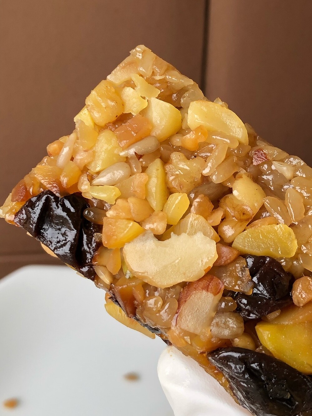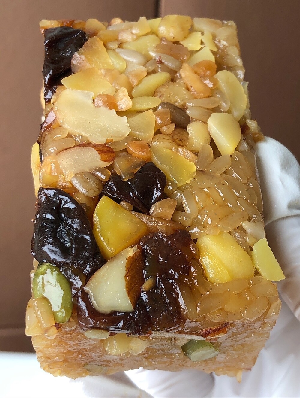 싱싱한 찹쌀을 셀렉하여 좋은 재료 가득 넣고 쫀득하게 고슬하게 찝니다. 아낌 없이 가득 넣은 재료들로 인해 참 풍성한 풍미를 자랑하지요. 한 조각만 먹어도 아주 훌륭하게 든든하게 잘 먹은 느낌이 들 거예요. 이 한 조각에 다양한 견과류들 그리고 담백한 밤과 대추가 풍성합니다. 이 재료와 잘 어우러지게 이 찰밥은 아주 고슬고슬하며 쫀득해요. 직접 짠 참기름의 풍미가 아주 녹진하고 고소함이 묵직하고요. 딱 홍블랑스레 만들어진 이 약밥, 여러 번 말씀드리지만 맛 자체가 아주 묵직하게 풍성하답니다.