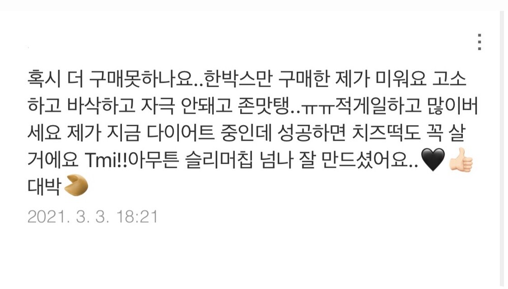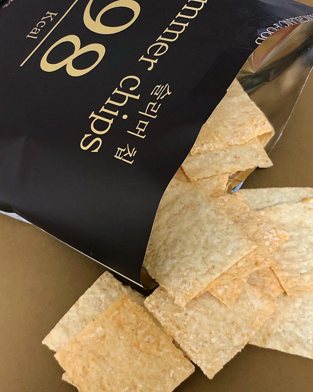 시중 판매되는 과자들은 대부분 튀긴 것들이기에 부피가 많아보일 수 있어요. 하지만 이 슬리머 칩은 튀긴 과자가 아닌 직접 원물을 구운 과자이기 때문에 비교적 부피가 적어보일 수 있으나 드셔보시면 넉넉하다, 라고 느끼실거예요.