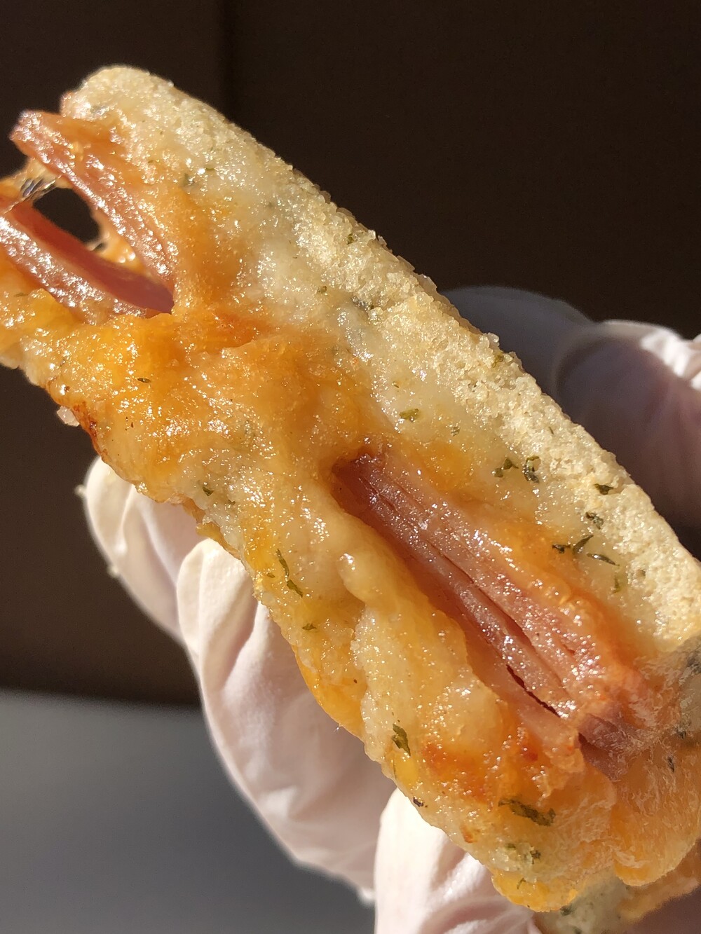 두툼한 햄을 한 번에 넣기보다는 얇은 햄을 단정하게 쌓아 여러 겹 두껍게 표현하여 식감과 풍미를 부드럽게 표현했고 체다 치즈의 녹진한 풍미와 식감이 너무 좋은 부드러운 모짜렐라 치즈를 함께 넣어 전체적으로 조합이 참 좋습니다.